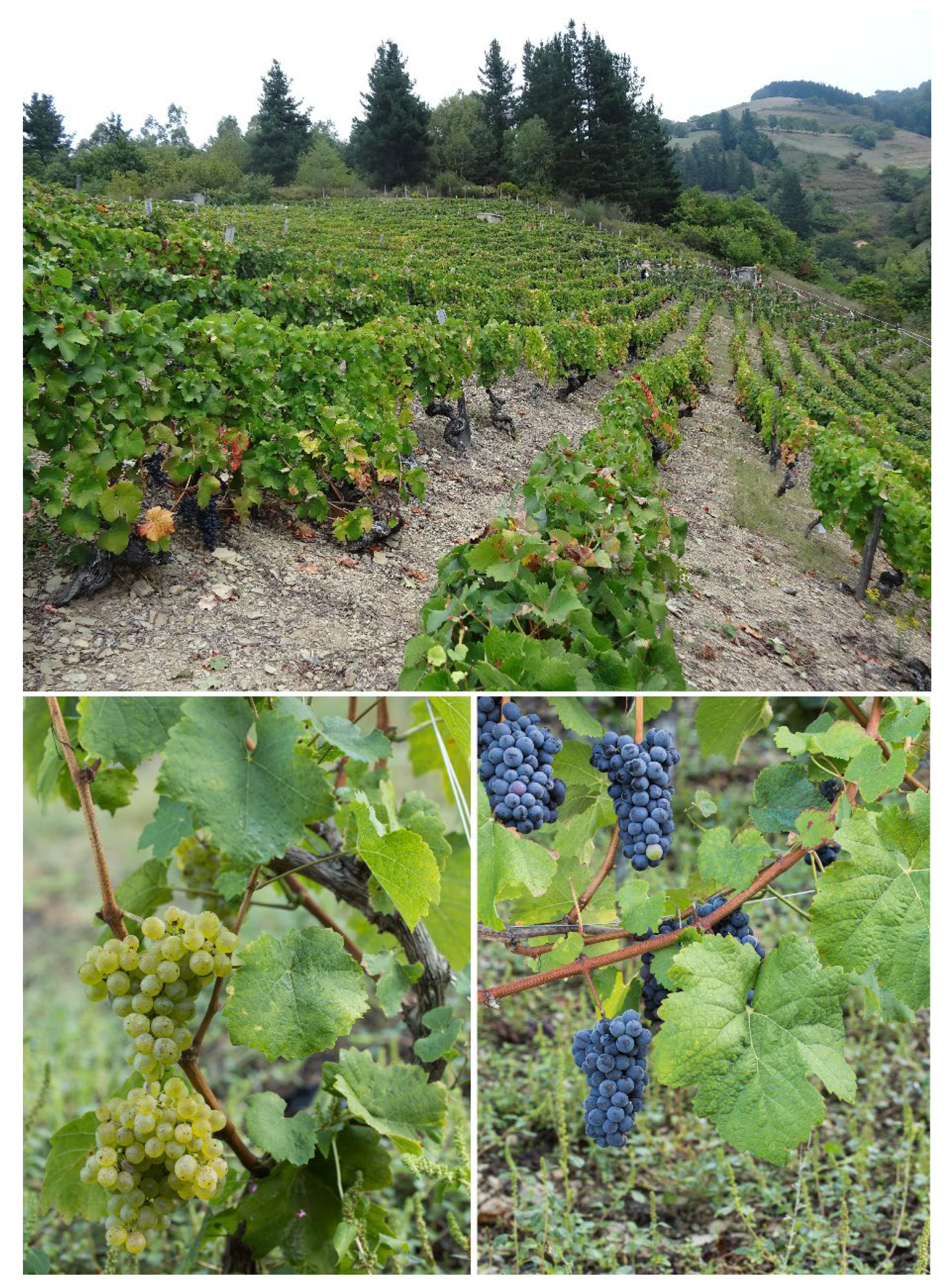 - Sánchez-Monfort, M.; Gracia, P.; Guasch, E.; López-Vicente, M.; Irigoyen, J.J.; Gogorcena, Y. Aptitud enológica de variedades de vid cultivadas en zonas de montaña. In Reuniones del Grupo de Trabajo de Experimentación en Viticultura y Enología Proceedings of the 34ª Reunión, Centro de Transferencia Agroalimentaria, Gobierno de Aragón, Zaragoza, Spain, 10–11 April 2019; pp. 167–173. [Google Scholar]