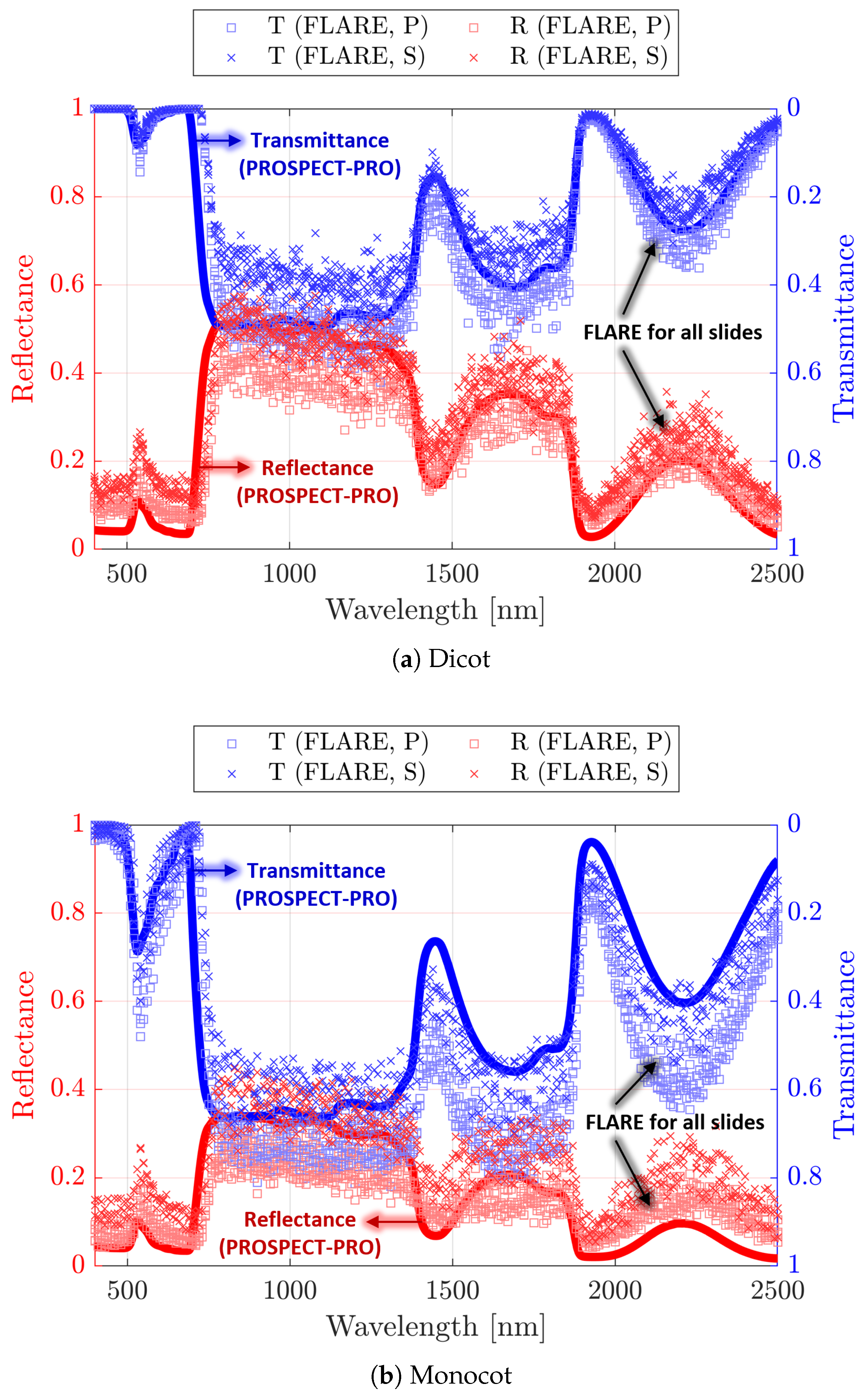 - Gerber, F.; Marion, R.; Olioso, A.; Jacquemoud, S.; Da Luz, B.R.; Fabre, S. Modeling directional–hemispherical reflectance and transmittance of fresh and dry leaves from 0.4 μm to 5.7 μm with the PROSPECT-VISIR model. Remote Sens. Environ. 2011, 115, 404–414. [Google Scholar] [CrossRef]