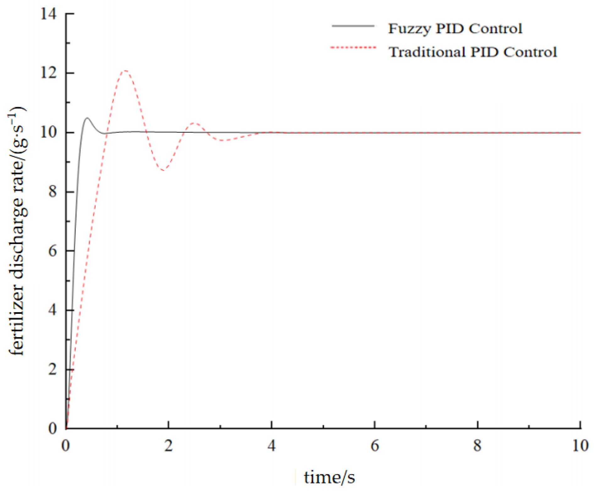 - A real-time precision regulation system control model for fertilizer quantity was established, utilizing fuzzy rules to dynamically adjust the parameters of the PID controller. A fuzzy PID control simulation model was created using MATLAB’s Simulink simulation module to analyze the PID parameters of the controlled object and study the system’s response speed and overshoot. The control effects of fuzzy PID and traditional PID algorithms were compared. The results showed that fuzzy PID control reduced the time required to reach steady state by 66.87% compared to traditional PID, and the overshoot decreased from 7.38 g·s−1 to 1.49 g·s−1.