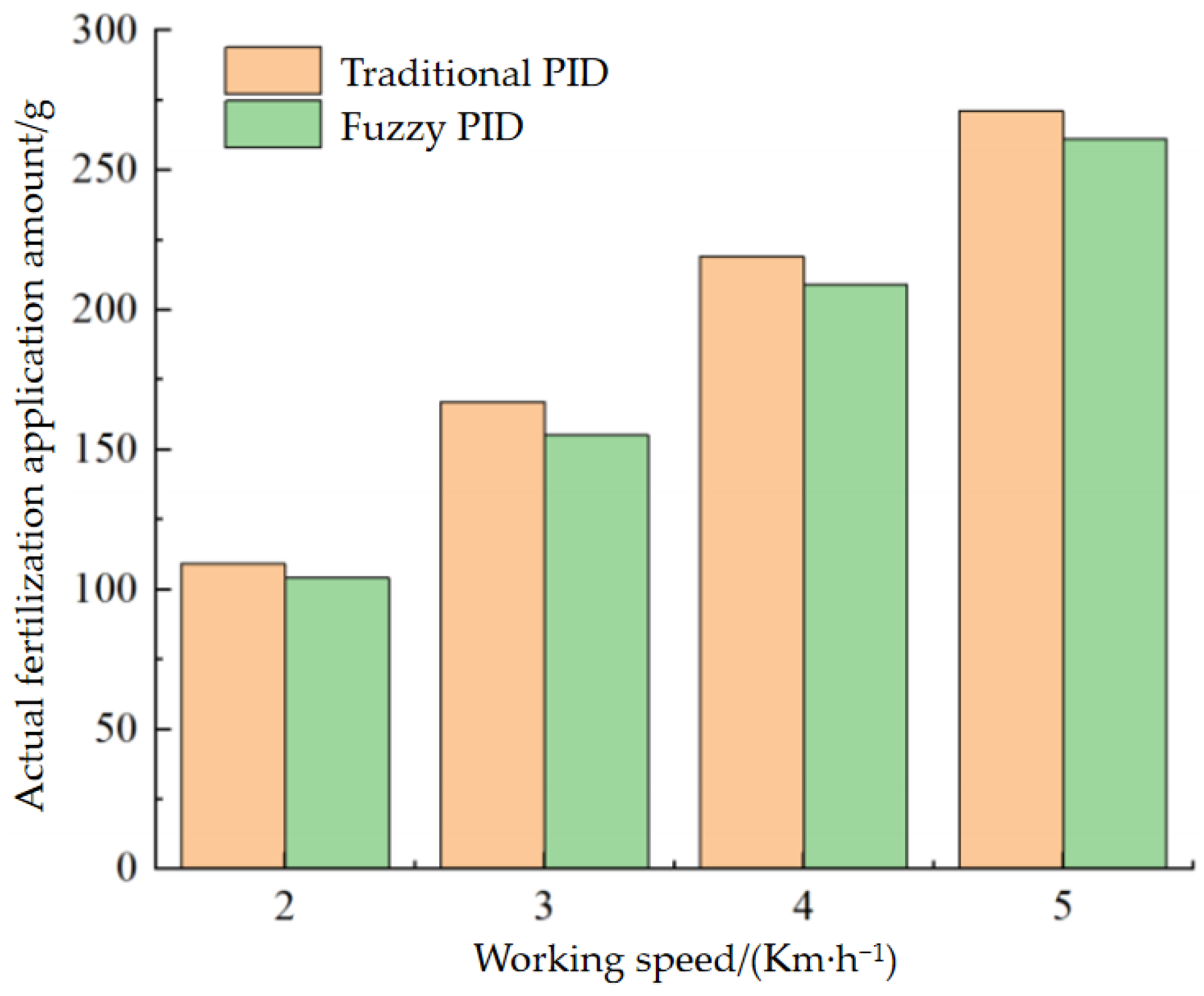 - Bench tests and field trials were conducted. The results of the bench tests showed that the average response time for fertilizer discharge rate changes under fuzzy PID control was 1.45 s, with an average reduction of 19.44% compared to traditional PID control. The minimum and average control accuracy of fertilizer discharge rate under fuzzy PID control was 95.50% and 95.94%, respectively, representing an average improvement of 5.50% over traditional PID control. Under different test conditions, both the response time for fertilizer discharge rate changes and the control accuracy of fertilizer discharge rate under fuzzy PID control were superior to those under traditional PID control. In field trials, when the operating speed was 2, 3, 4, and 5 km·h−1, the control accuracy of fertilizer discharge rate under the fuzzy PID control system reached 96.22%, 95.13%, 95.42%, and 95.36%, respectively, with an average of 95.53%.