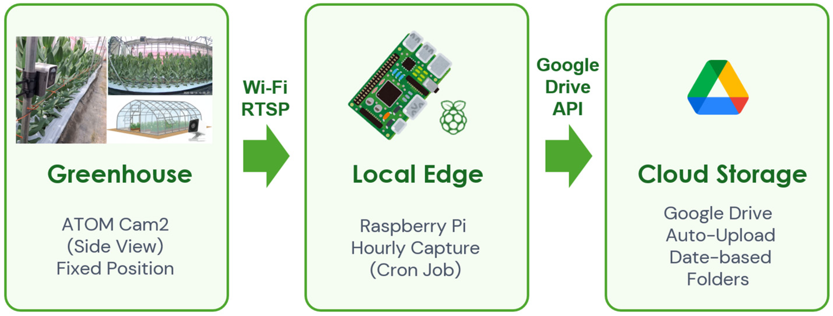 Each camera was connected via Wi-Fi to a local network and was configured to be accessible from a Raspberry Pi (Models 3 B, 3 B +, and 3A+; Raspberry Pi Ltd., Cambridge, UK) on the same network. The IP addresses of each camera were crawled on a Raspberry Pi, and still images were obtained using the RTSP protocol. The hourly scheduled image capture was automated using the cron scheduler implemented in Raspberry Pi OS (Raspberry Pi Ltd., Cambridge, UK). Images were saved in the JPEG format at a resolution of 1920 × 1080 pixels (Full HD). Natural daylight was used for illumination, without artificial lighting. To mitigate the effects of diurnal and day-to-day variations in lighting intensity, representative daytime images were selected at a fixed time each day, as described in