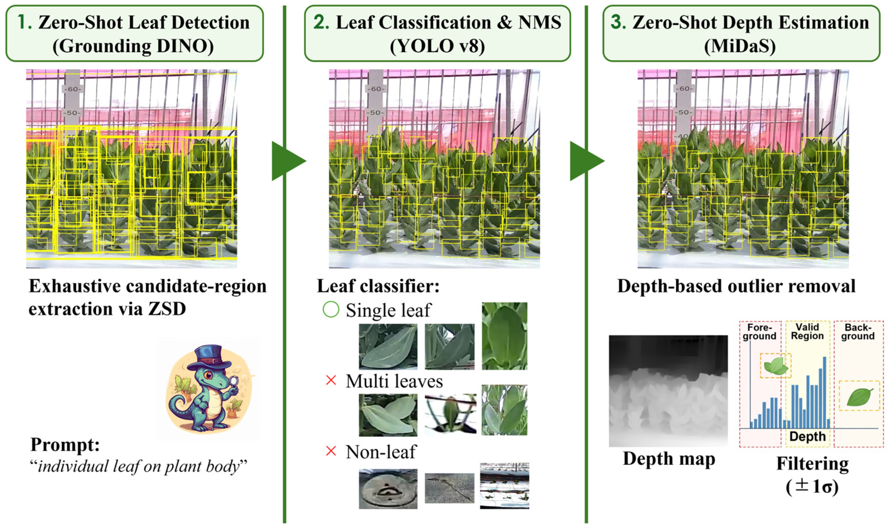 Figure 2. By combining leaf region detection via Grounding DINO (v1.0; IDEA Research, Shenzhen, Guangdong, China), region filtering using a YOLO (v8.0; Ultralytics Inc., Frederick, MD, USA) classifier, and monocular depth estimation via MiDaS (v3.1; Intel Corporation, Santa Clara, CA, USA), we constructed a pipeline capable of estimating leaf numbers for