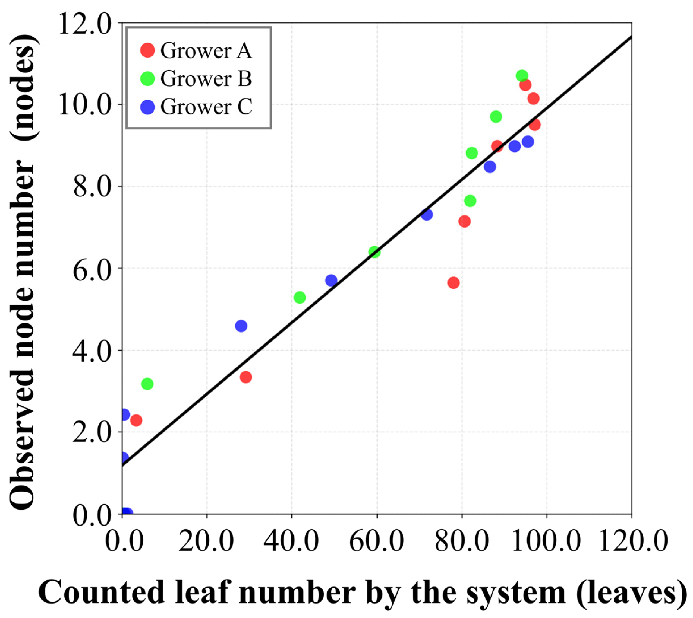 R2 = 0.930 and a mean absolute error (MAE) of 0.73 (n = 26). Trends were generally consistent across growers, and the model successfully reproduced the pattern of increase in node number, even during the later growth stages when leaf density increased. This indicates that the model effectively functioned as a quantitative indicator of the growth stage.