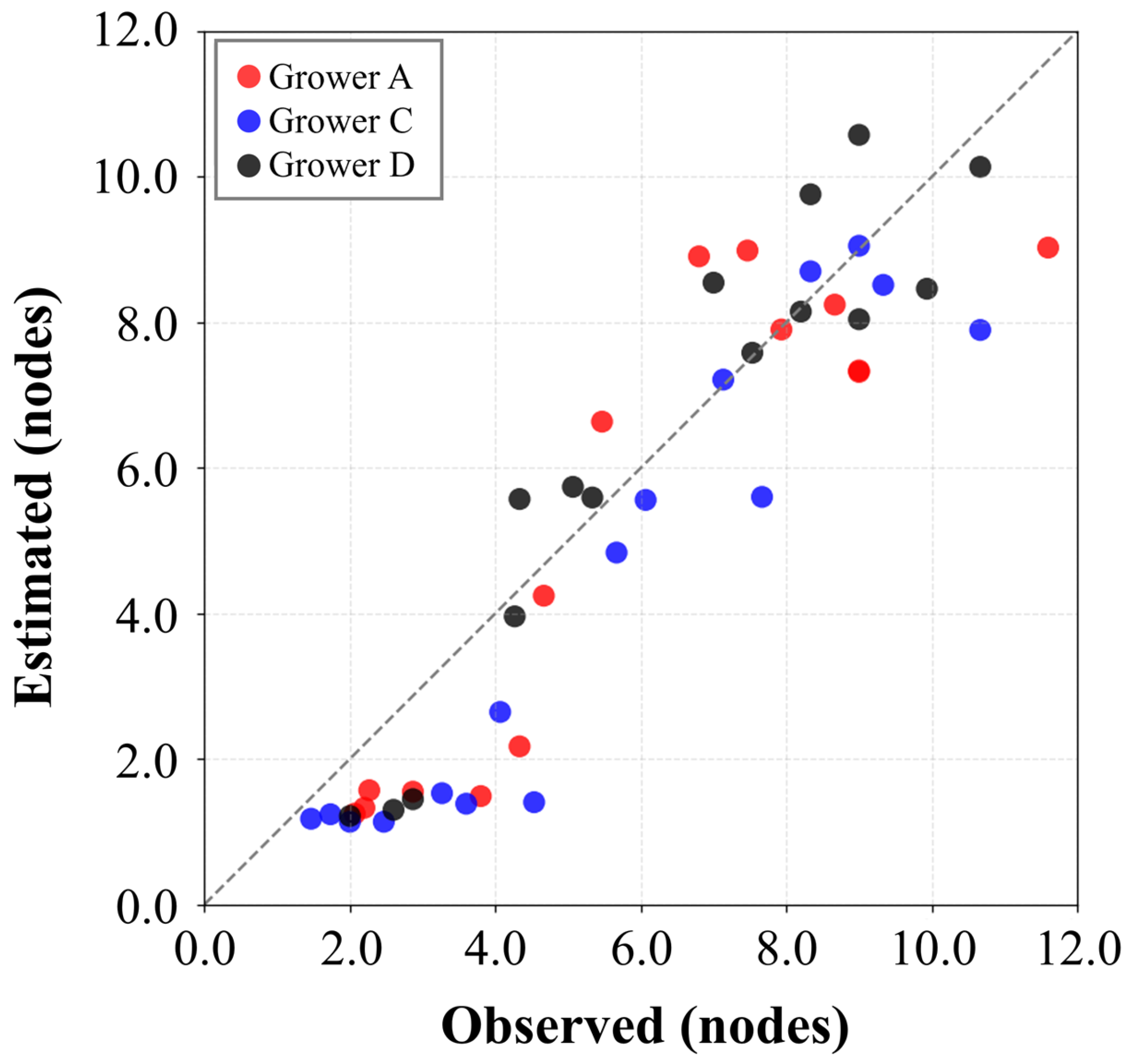 The coefficients of the linear equation (0.09 and 1.03) were derived through least-squares regression using manually surveyed node data collected from the fields of the three growers in Trial 1. The observed node number was calculated as the mean of the 36 plants per grower. Field surveys were conducted weekly, with ten surveys performed during the monitoring period.