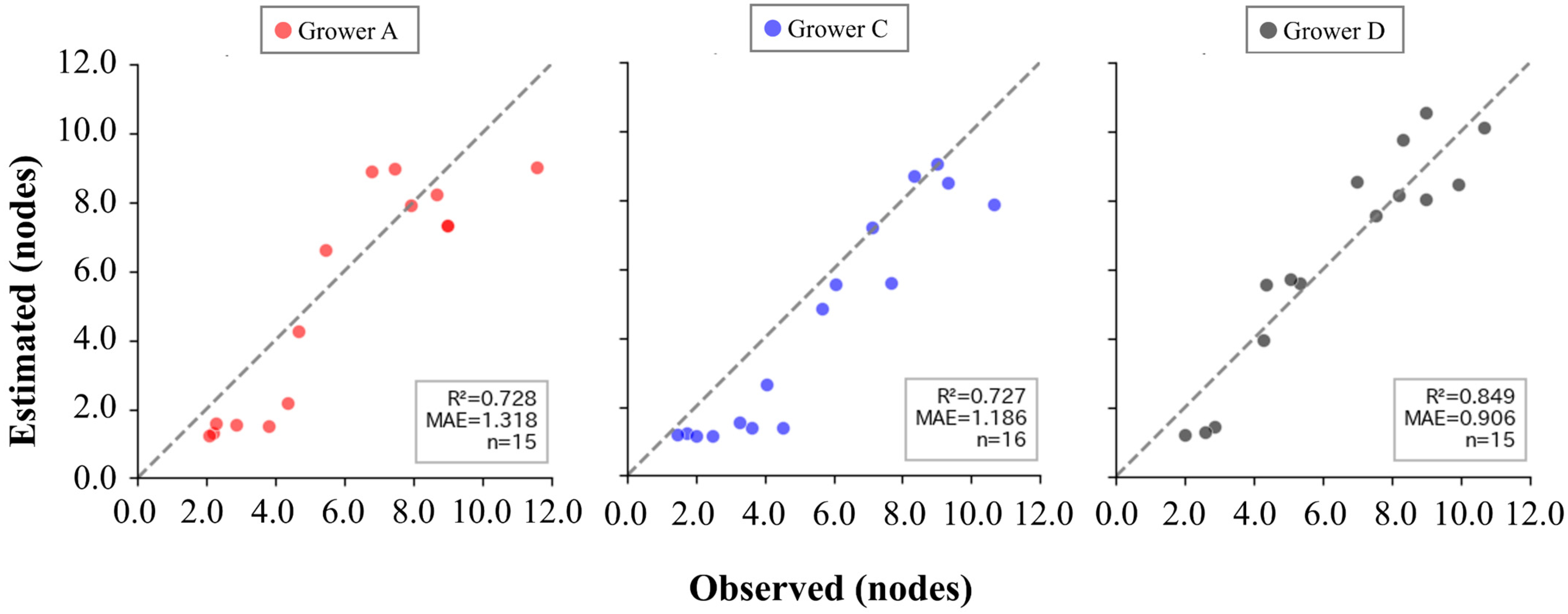 In Trial 3, the node-estimation model constructed and validated in Trial 1 during the previous year was applied directly to the data from the following year to verify its reproducibility and generalization performance across multiple growers and cultivars.