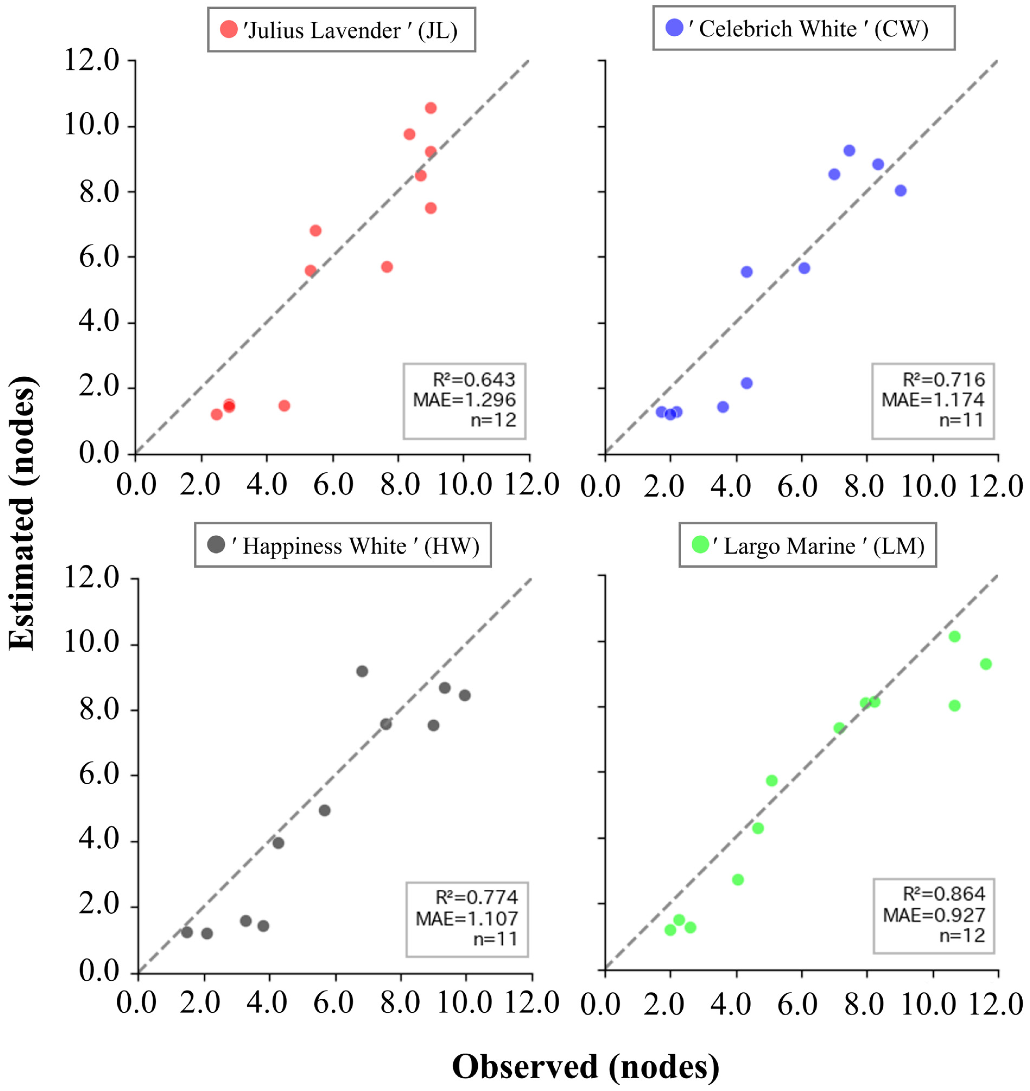 Table 4. All cultivars exhibited a clear positive correlation between the estimated and observed node numbers, confirming that the linear model-based estimation approach was effective across cultivars. The MAE values for all cultivars were within 1.3 nodes, and no extreme degradation in performance attributable to cultivar characteristics was observed. For JL and CW, the MAE values were 1.30 and 1.17, respectively, indicating moderate accuracy. HW, the cultivar used to determine the model parameters, achieved an MAE of 1.11, indicating high consistency. LM, a late-maturing cultivar, was the only cultivar with an MAE below 1.0 (MAE = 0.93), and it exhibited the most stable performance among the four cultivars. Comparing the cultivar maturity groups, late-maturing cultivars tended to show lower errors and more stable estimates than mid-maturing cultivars (