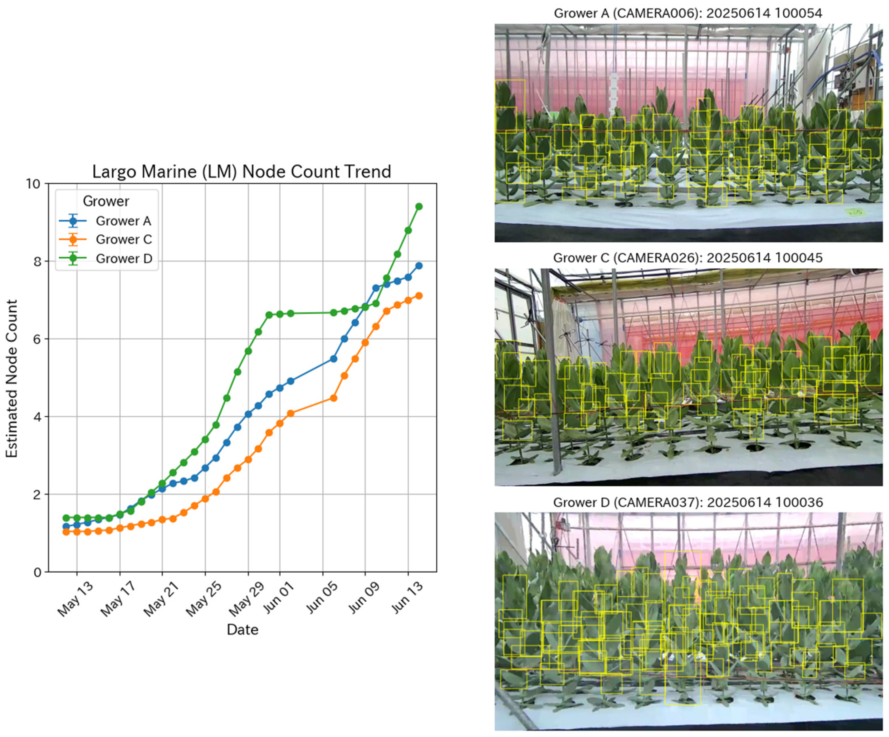 Trial 3 was conducted the following year using the same seasonal cropping type to verify the reproducibility of the estimation method established in Trial 1. In this trial, node-count estimation was performed not only for the cultivar used in model development (HW) but also for three additional cultivars (JL, CW, and LM) and under conditions including the participation of a new grower (Grower D). This allowed us to assess the stability of the model across different cultivars and growers. Additionally, an operational test was conducted to share the estimation results with growers in real-time, enabling an examination of the model’s practicality and potential for implementation in real-world production settings.