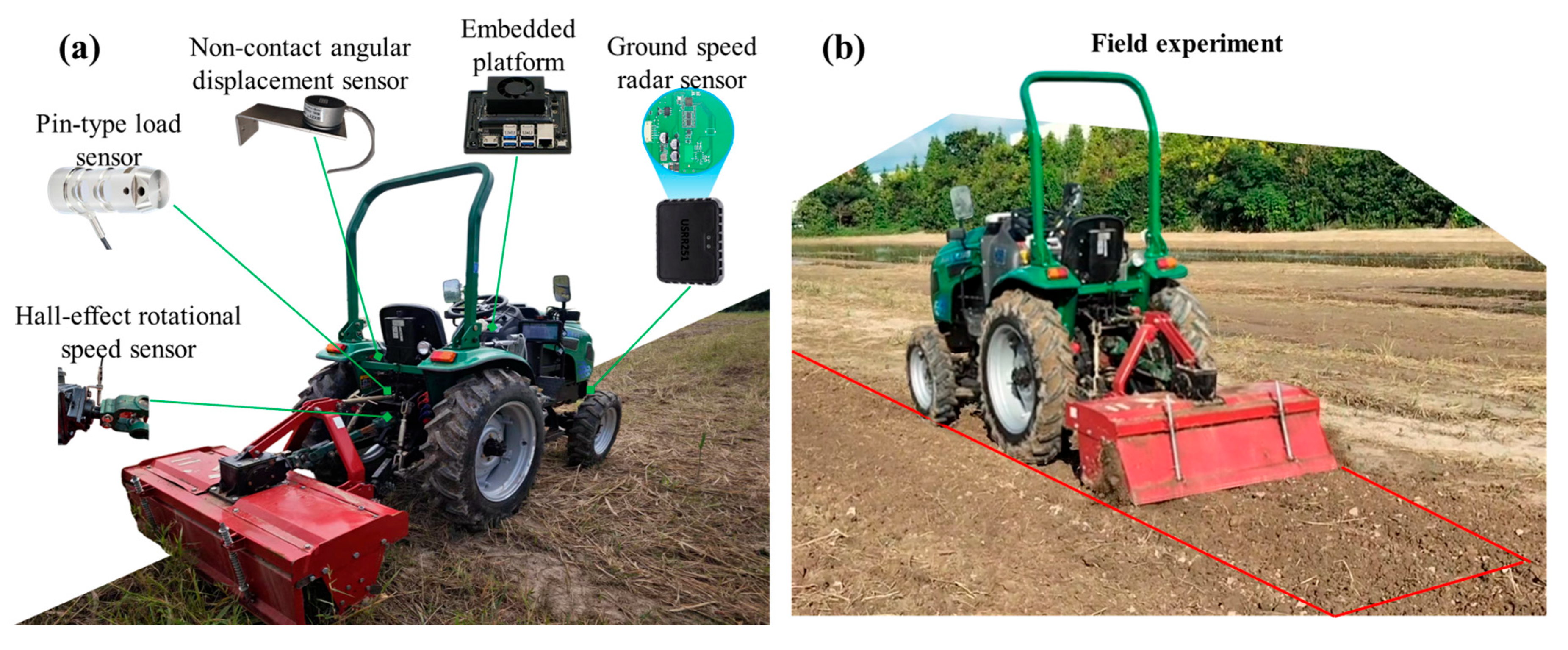 - Huang, X.; Wang, X.; Wang, Y.; Shi, Y.; Lv, H.; Zheng, J.; Chen, Y. Multi-objective optimization and experimental analysis of rotary tillage parameters for horticultural electric tractors. Comput. Electron. Agric. 2025, 231, 109962. [Google Scholar] [CrossRef]