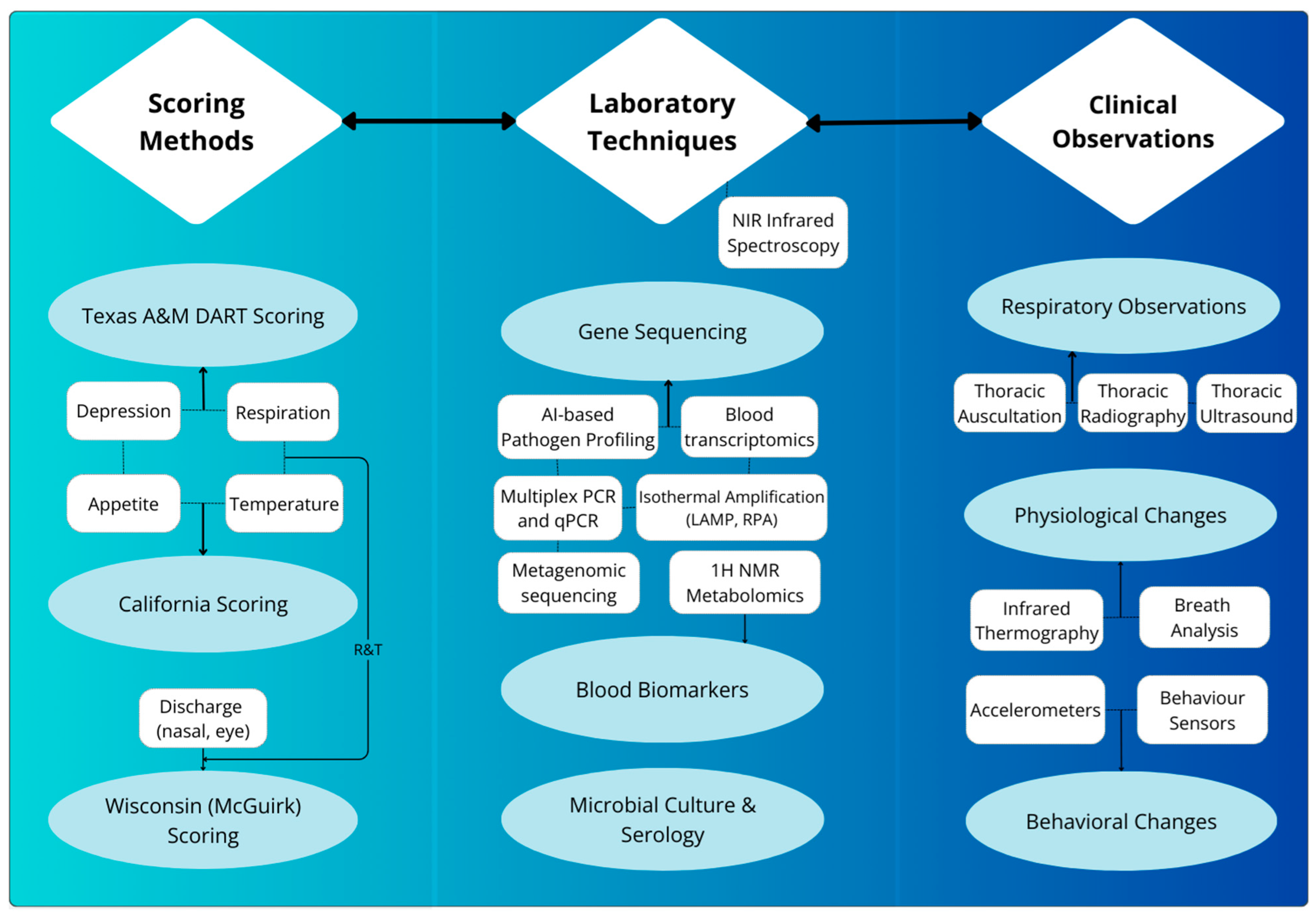 | DART Scoring | Subjective clinical signs: depression, appetite, respiration, temperature | Low-cost; easy to implement quickly in the field | Low sensitivity/specificity (<70%); high inter-observer variability. | [49,50,56] |