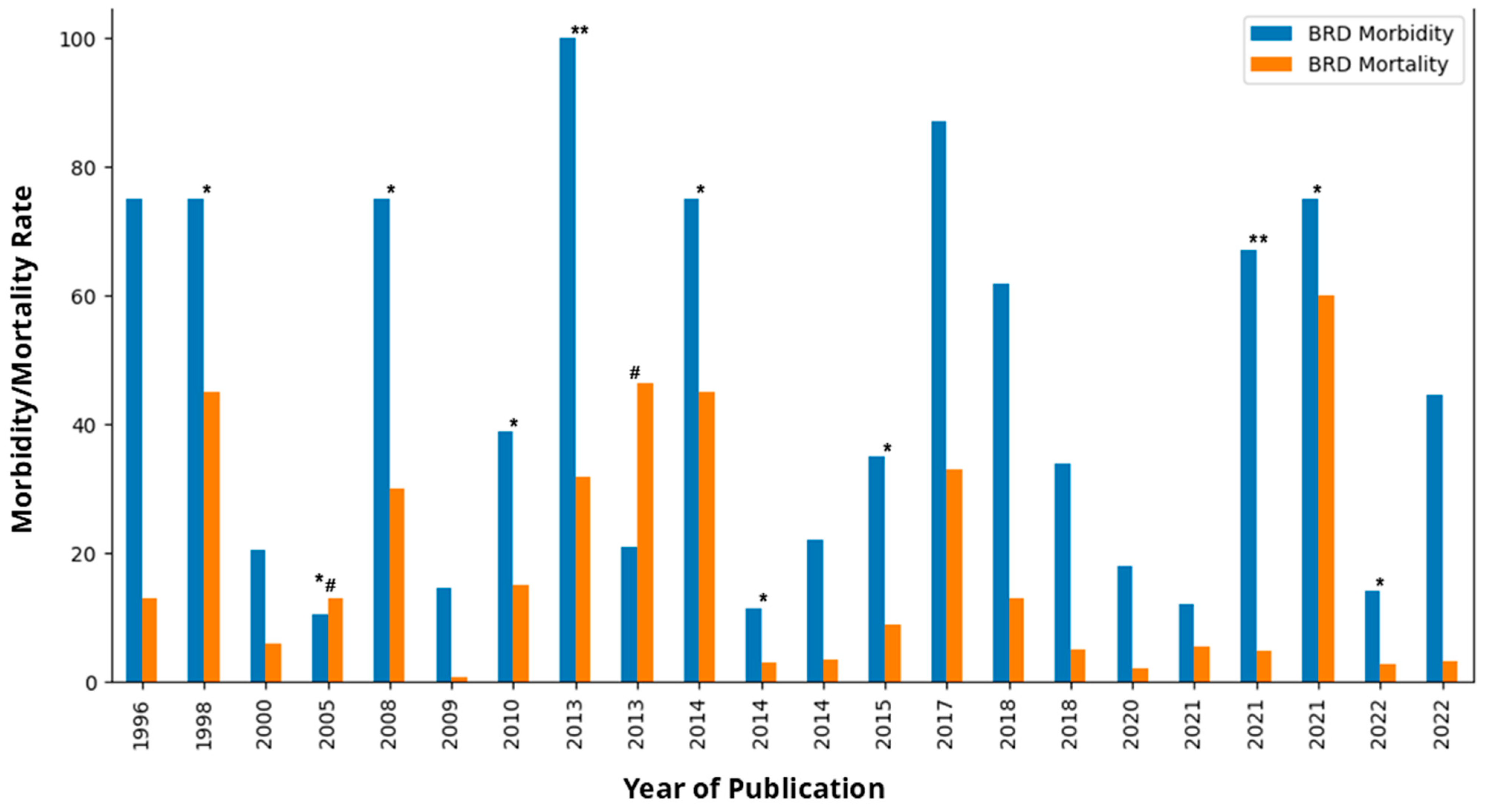 | BRD Morbidity, % | BRD Mortality, % | Reference (Author, Year) |