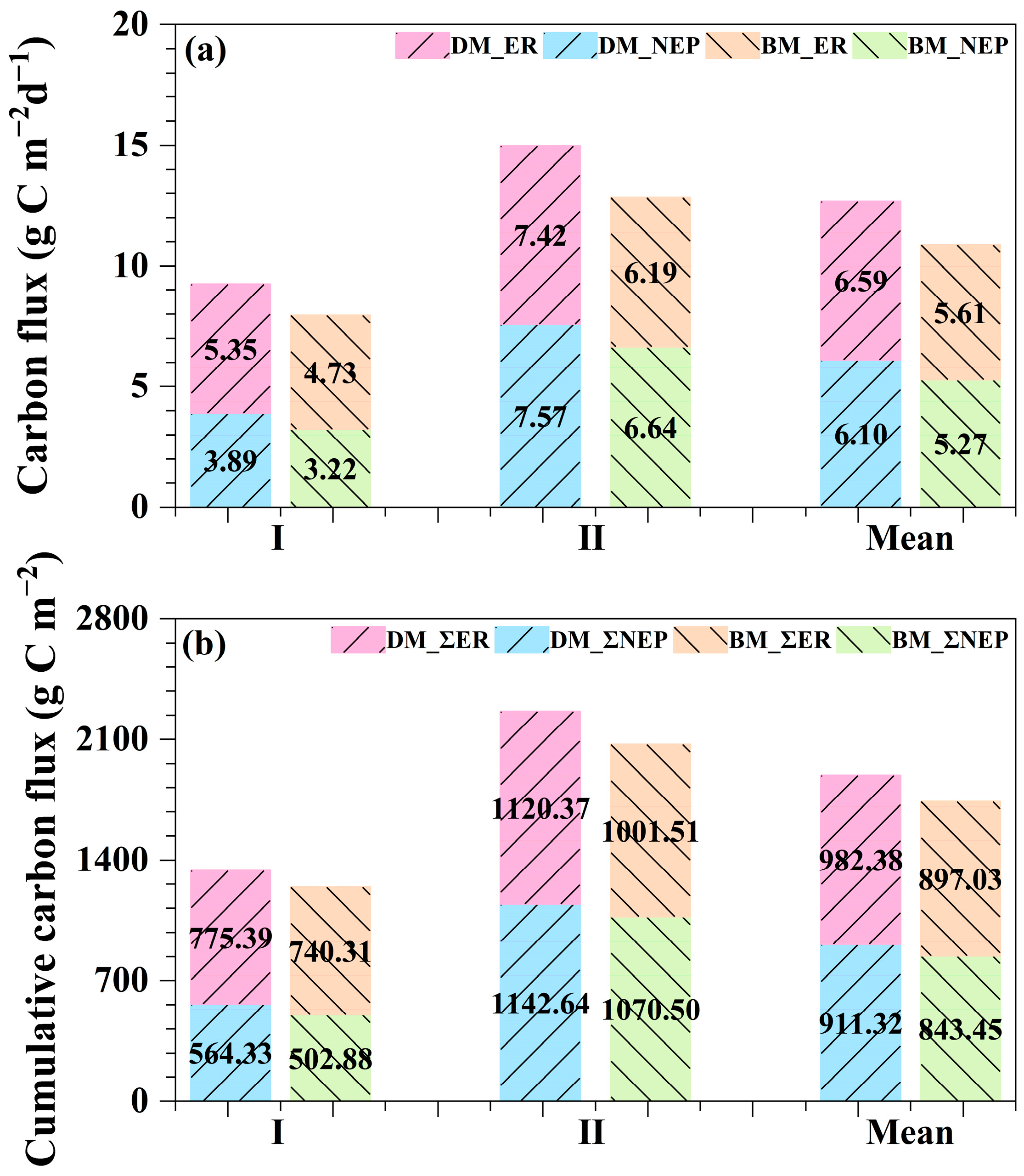- The DM system enhanced photosynthetic assimilation, ecosystem respiration, and net carbon sequestration compared to BM. Over the entire growth period, ΣGPP, ΣNEP, and ΣER under DM were 8.89%, 8.05%, and 9.51% higher than under BM, respectively.