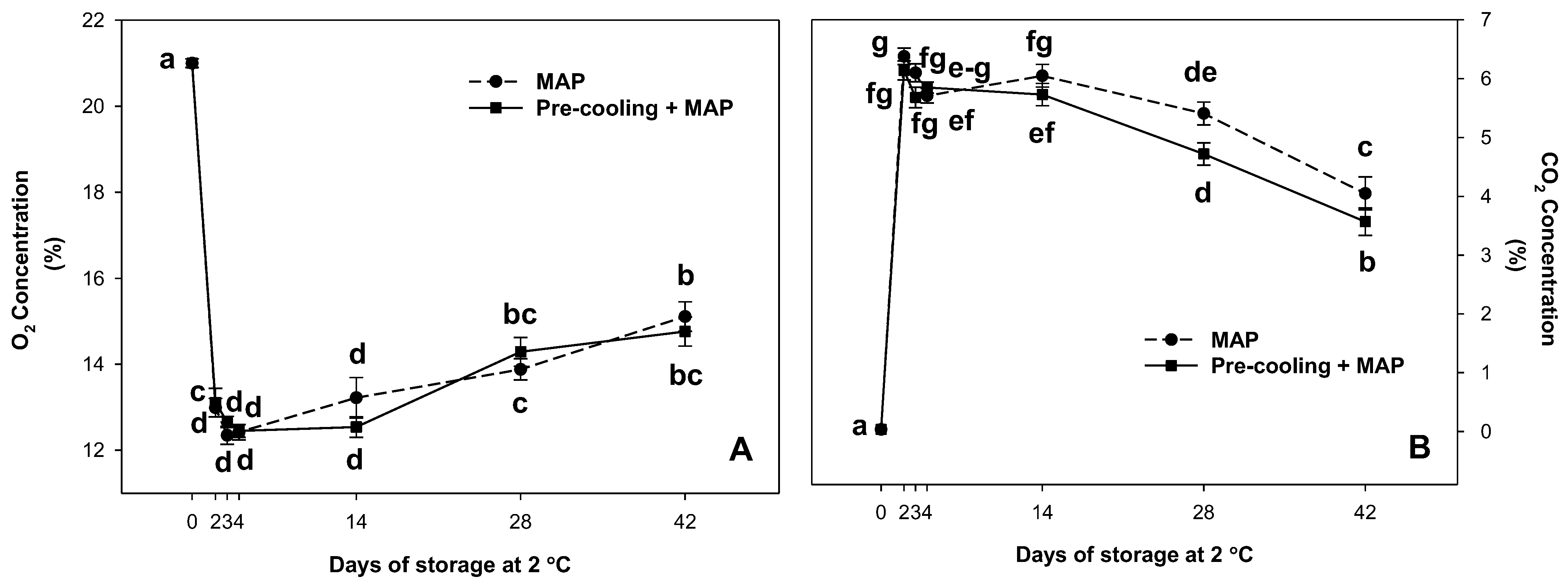 2 concentrations compared to Pre-cooling + MAP, with these differences becoming more pronounced at days 28 and 42 of storage.