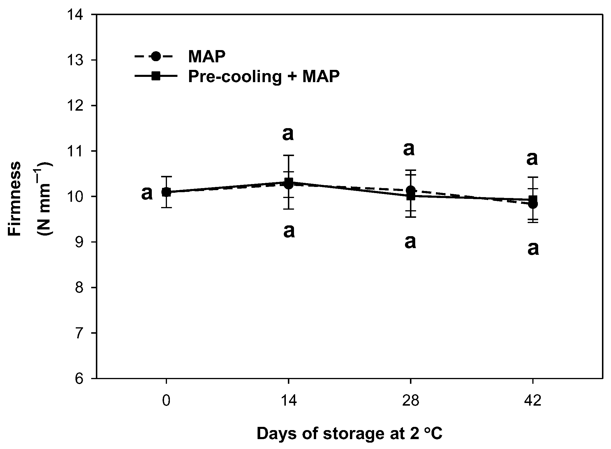 No significant differences in firmness values were observed between the MAP and Pre-cooling + MAP treatments throughout the storage period (