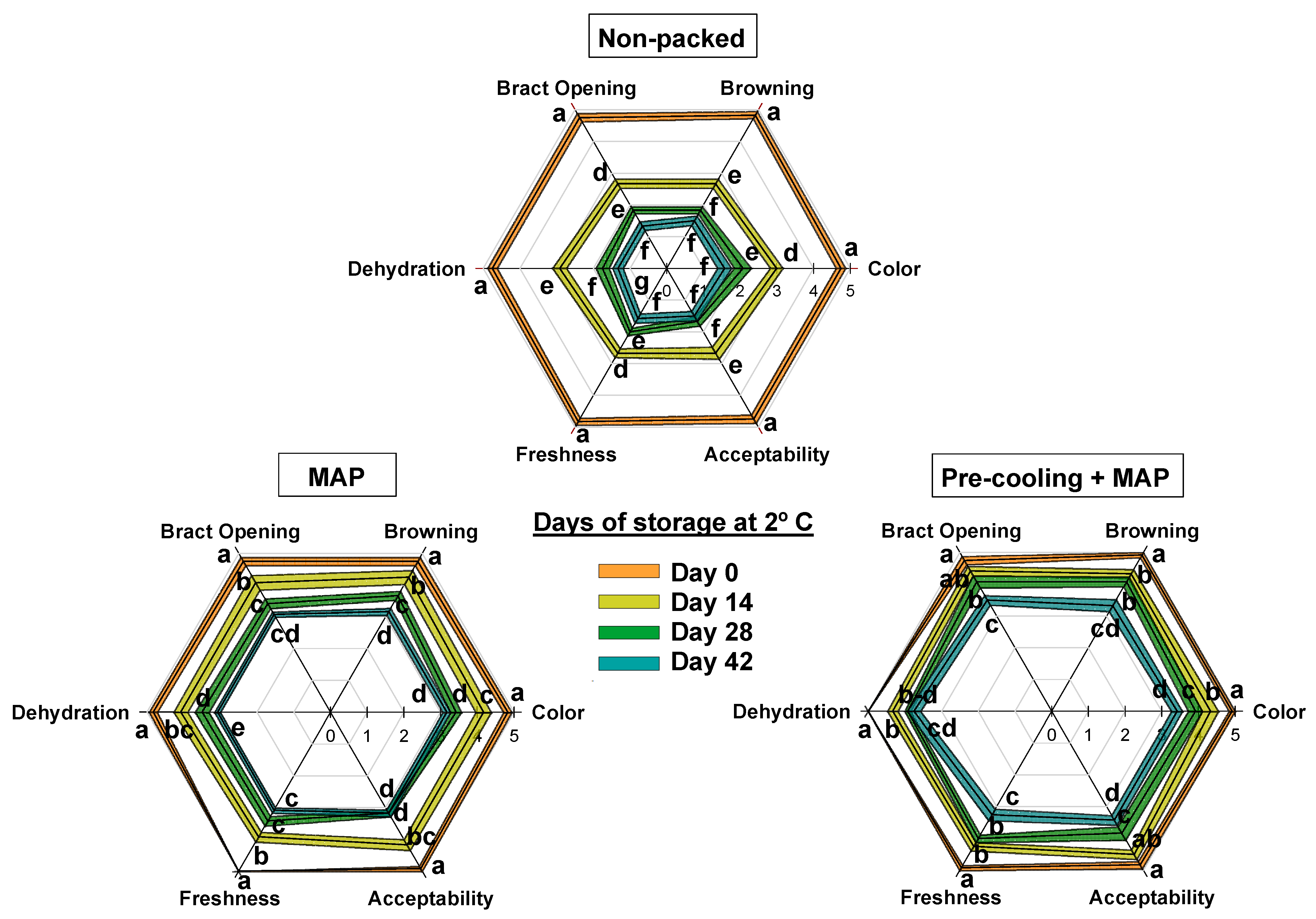 Overall, the integration of pre-cooling with MAP appears to be the most effective strategy for delaying senescence and preserving the physicochemical, functional, and sensory quality of whole ‘Blanca de Tudela’ artichokes. While MAP alone may significantly improve storage performance compared to non-packed samples, the addition of pre-cooling could provide an added advantage by mitigating early metabolic stress and reinforcing long-term quality retention. It is important to note that these conclusions are grounded in the defined sensory acceptability thresholds (score ≥ 3) and represent measured quality retention under controlled conditions; true commercial shelf-life would require validation under actual supply-chain scenarios, including transport, retail handling, and buyer-specific criteria.
