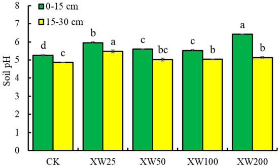 The soil pH ranged from 5.26 to 6.42 at the depth of 0–15 cm and from 4.87 to 5.48 at the depth of 15–30 cm (Figure 1), with basalt addition increasing soil pH at both depths. Compared with CK, the soil pH with XW25, XW50, XW100 and XW200 treatments increased by 13.2%, 6.4%, 5.0% and 22.0%, respectively, at 0–15 cm, and by 12.5%, 3.2%, 3.4% and 5.4%, respectively, at 15–30 cm.