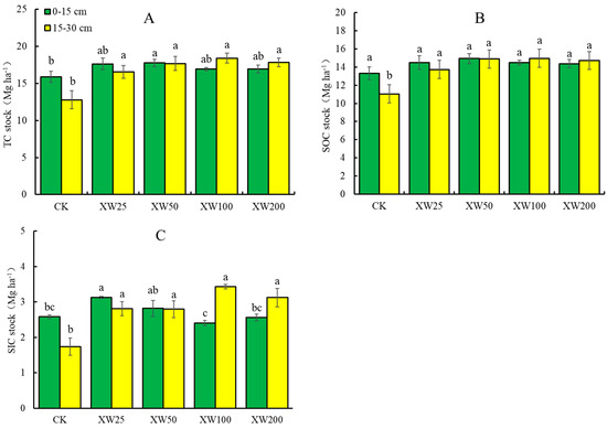Basalt addition increased the TC stocks at both 0–15 cm and 15–30 cm (Figure 3A). Compared with CK, the TC stocks under the XW25, XW50, XW100 and XW200 treatments increased by 11.0%, 11.7%, 6.5% and 6.7%, respectively, at 0–15 cm, and by 29.4%, 38.4%, 44.0% and 39.6%, respectively, at 15–30 cm. These results indicated that the increase in TC content at 15–30 cm was greater than that at 0–15 cm.