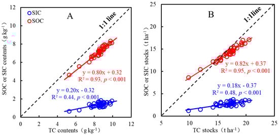 Linear relationships of total carbon contents with soil organic carbon or soil inorganic carbon content (A), and total carbon stocks with soil organic carbon or soil inorganic carbon stocks (B). TC, total carbon; SOC, soil organic carbon; SIC, soil inorganic carbon.