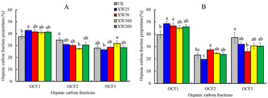 Proportions of soil organic carbon fractions in total soil organic carbon at the 0–15 cm (A) and 15–30 cm (B). Different lowercase letters mark significant differences at p < 0.05 among basalt addition rates. CK, XW25, XW50, XW100 and XW200 indicate basalt addition rates of 0, 2.5, 5, 10 and 20 kg·m−2, respectively. OCF1, OCF2 and OCF3 are the very labile, labile and stable carbon fractions, respectively.