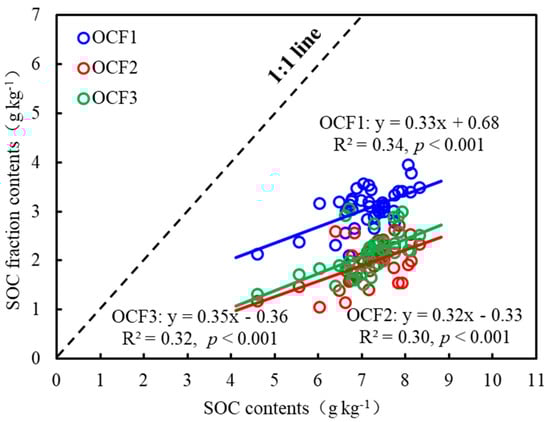 Linear relationships of soil organic carbon contents with different organic carbon fraction contents. OCF1, OCF2 and OCF3 are the very labile, labile and stable carbon fractions, respectively. SOC, soil organic carbon.