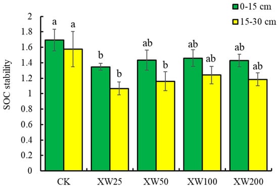 Basalt addition significantly reduced the SOC stability, and the reduction at 15–30 cm was greater than that at 0–15 cm (Figure 7). Compared with CK, basalt addition rates of XW25, XW50, XW100 and XW200 decreased the SOC stability by 24.4%, 15.4%, 13.8% and 15.6%, respectively, at 0–15 cm, and by 32.3%, 26.4%, 21.2% and 24.9%, respectively, at 15–30 cm.