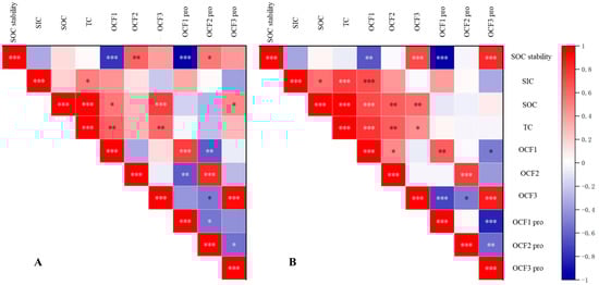 Correlations between soil organic carbon stability and different soil carbon fractions at 0–15 cm (A) and 15–30 cm (B). SOC, soil organic carbon; SIC, soil inorganic carbon; TC, total soil carbon; OCF1, very labile carbon fraction; OCF2, labile carbon fraction; OCF3, stable carbon fraction; OCF1 pro, proportion of very labile carbon fraction; OCF2 pro, proportion of labile carbon fraction; OCF3 pro, proportion of stable carbon fraction. *, **, *** indicate significant difference at p < 0.05, p < 0.01 and p < 0.001, respectively.
