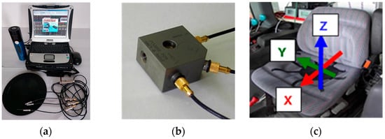 The instrumentation chain used in the tests. (a) Seat-mounted triaxial accelerometer, accelerometer calibrator, eight-channel soundbook-signal acquirer/processor; (b) Triaxial accelerometer positioned on the tractor’s cab floor; (c) The driver seat equipped with triaxial accelerometer and system of coordinates for the orientation of the accelerometer for seated position.