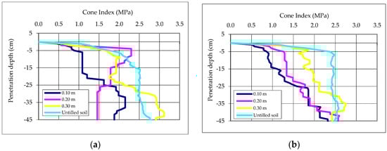 The average Cone Index in the three positions from the furrow centre. (a) Treatment A: oscillating plate in action; (b) Treatment B: oscillating plate inactive.