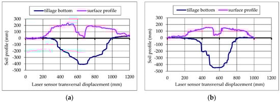 Following subsoiler passage, the working depth and the uniformity of the bottom of the tilled layer were measured on the same soil section, transversally to the working direction. These measurements were obtained as the standard deviations (σ) of data recorded by an in-house designed profile meter [52,53]: a laser sensor (Leica Geosystem Disto, Heerbrugg, Switzerland), mounted on a horizontal bar and moved stepwise by an electric motor. The sensor measured the distance from the soil surface at 5 mm intervals, thereby reconstructing the profile of both the soil surface and the bottom of the tilled layer.