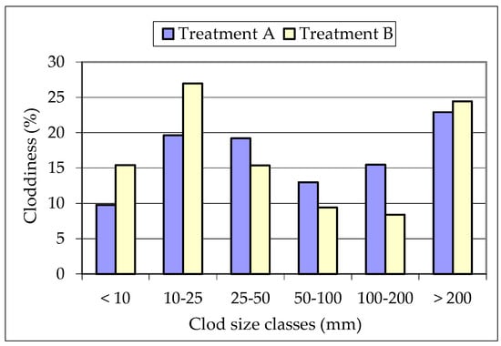 The activation of the oscillating plate (Treatment A) occurs by engaging the tractor’s Power Take-Off (PTO), which transmits the power required to overcome the soil’s resistance to the oscillations. Compared to Treatment B, this results in higher values for forward speed, hourly fuel consumption, and average total engine power output, while lower values are observed for drawbar pull and wheel slip (Table 3). Given the same tractor settings (engine speed, gear ratio) in both cases, the 4.9 kW PTO power observed in Treatment A stems primarily from the transfer of a portion of the traction power (17.0 kW in Treatment A vs. 19.37 kW in Treatment B) and lower power dissipation due to slip (4.04 kW in Treatment A vs. 5.56 kW in Treatment B). This indicates that the oscillating device effectively performs a soil-shattering action within the tilled layer.