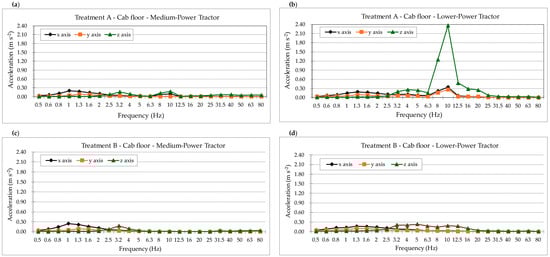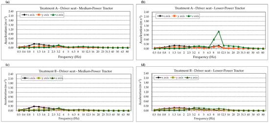 Weighted accelerations recorded on the tractor’s cab floor: (a) Subsoiler (Treatment A) coupled with the Medium-Power Tractor; (b) Subsoiler (Treatment A) coupled with the Lower-Power Tractor; (c) Subsoiler (Treatment B) coupled with the Medium-Power Tractor; (d) Subsoiler (Treatment B) coupled with the Lower-Power Tractor.