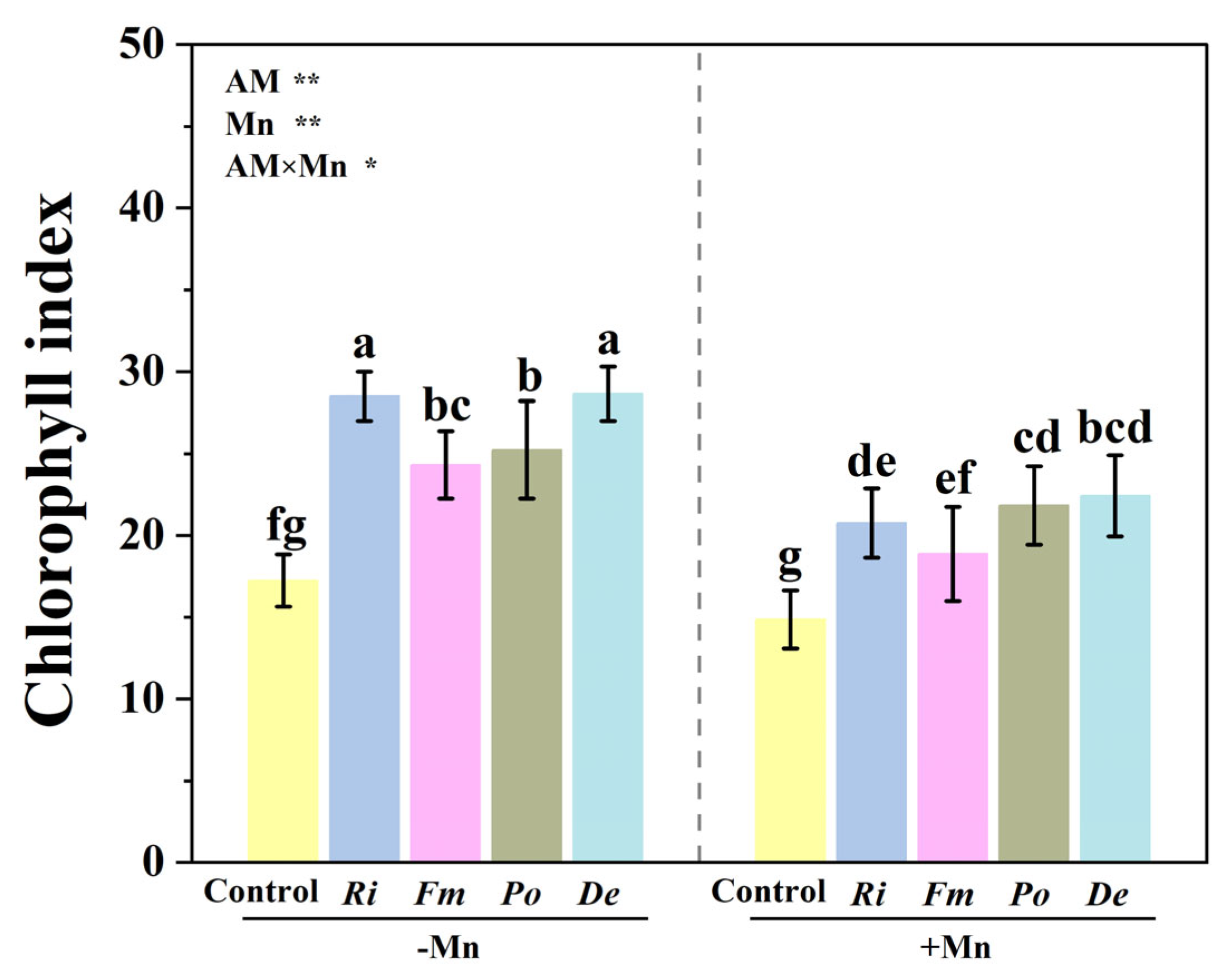3.3. Regulation of Chl by AM Fungi in Response to Mn Stress