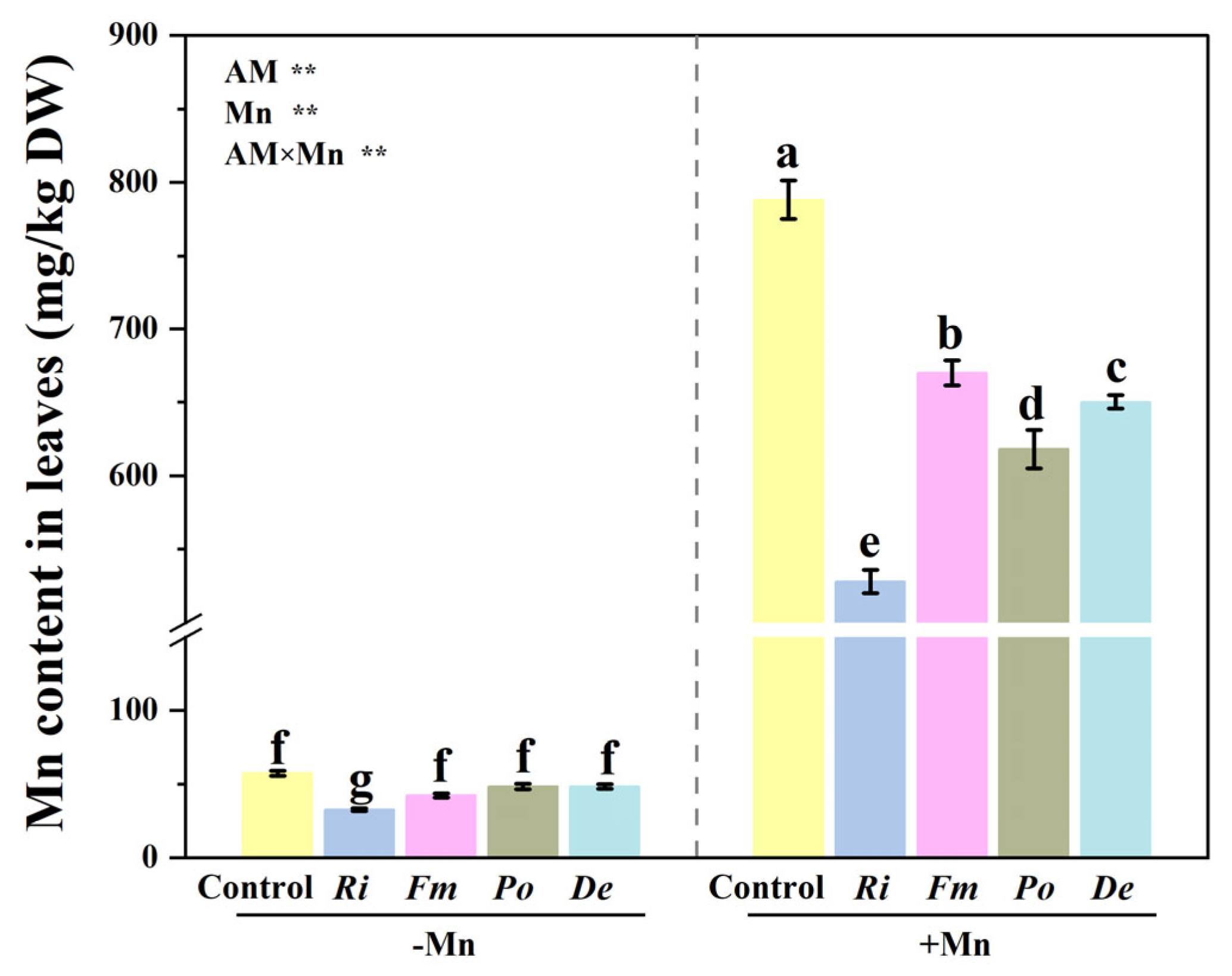 3.4. Regulation of Leaf Mn Content by AM Fungi in Response to Mn Stress