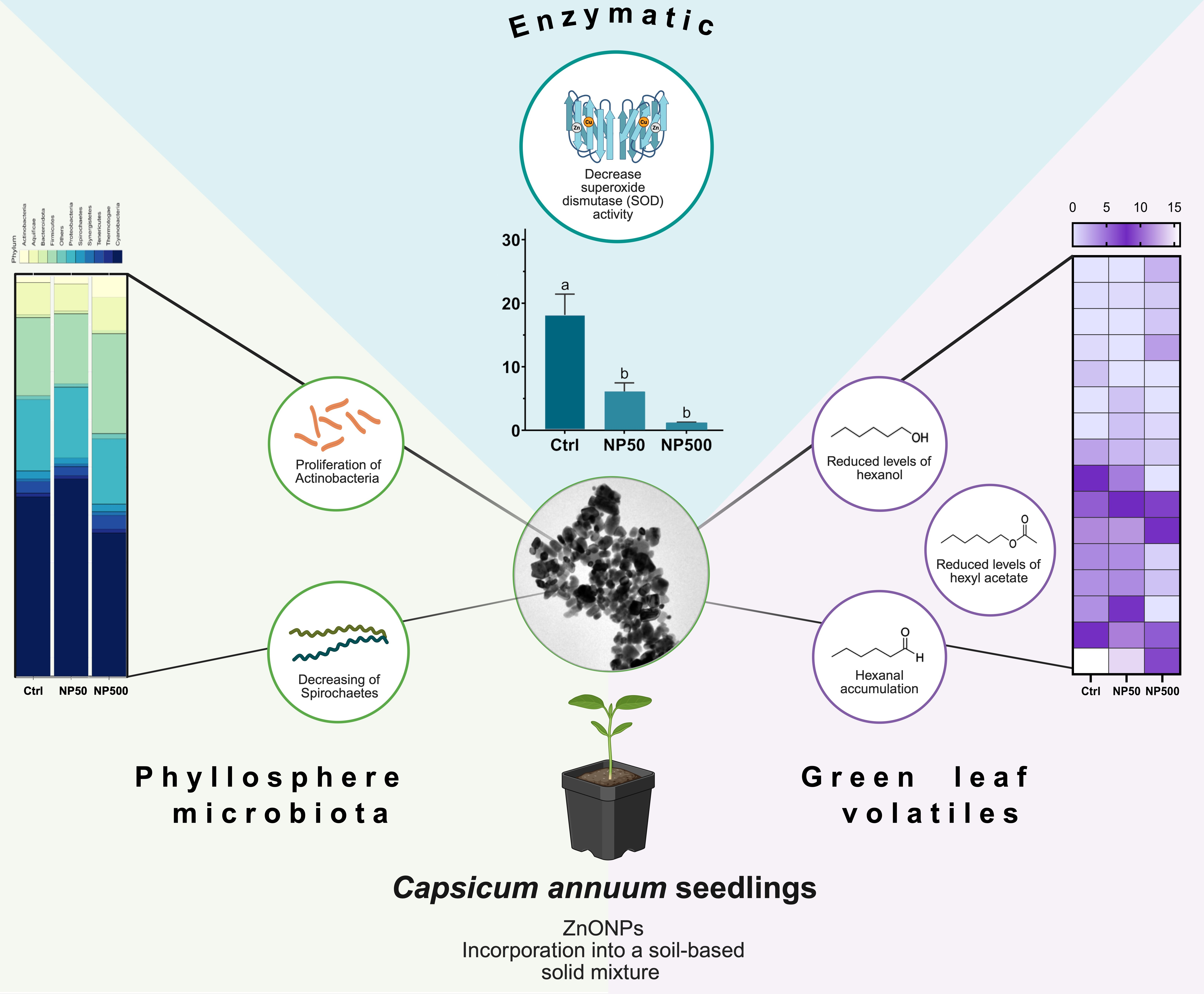 Chicago/Turabian StyleGarcía-Casillas, Luis Alberto, Oscar Kevin Reyes-Maldonado, Rosa Sánchez-Fernández, Víctor Manuel Zúñiga-Mayo, Adalberto Zamudio-Ojeda, Diego Alberto Lomelí-Rosales, César Ricardo Cortez-Álvarez, Rebeca Escutia-Gutiérrez, Santiago José Guevara-Martínez, and Gilberto Velázquez-Juárez. 2026. "Zinc Nanoparticle Effects on the Green Leaf Volatiles and Phyllosphere Bacteriome in Capsicum annum Seedling" Agriculture 16, no. 3: 345. https://doi.org/10.3390/agriculture16030345