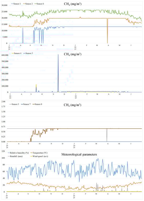 Daily results of methane (CH4) concentrations and meteorological parameters in the 8 sensors from July 2024 to June 2025.