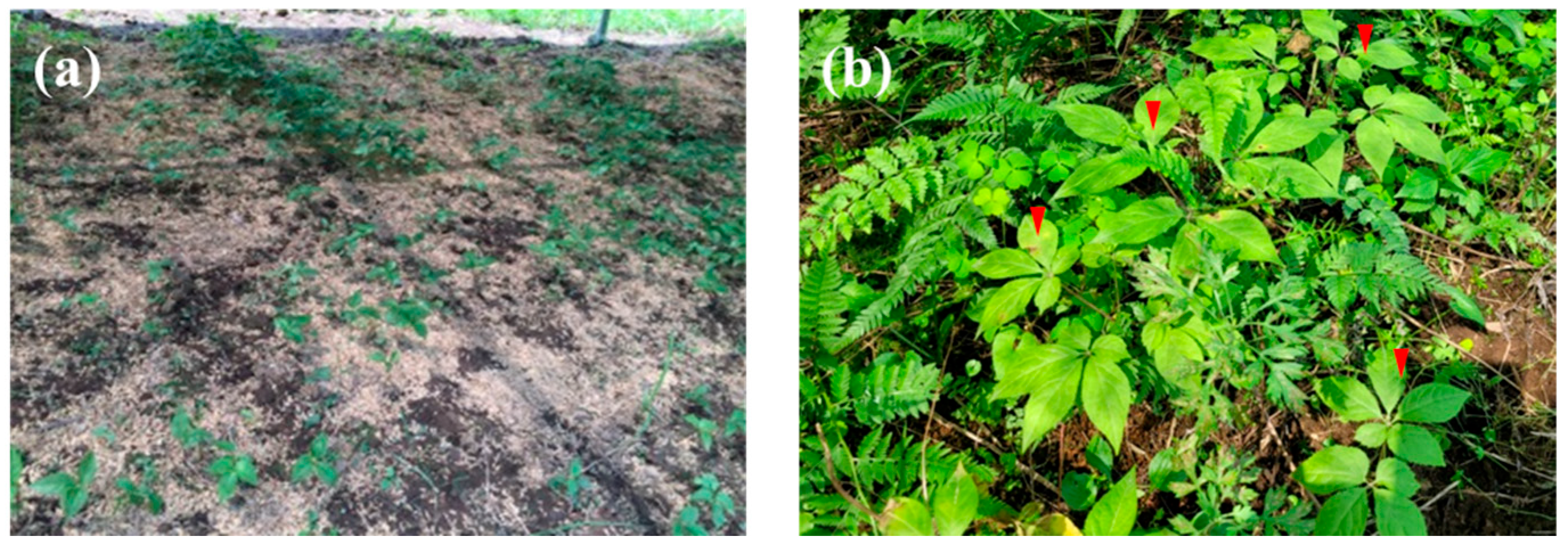 - Yong, S.H.; Seo, Y.R.; Kim, H.G.; Park, D.; Seol, Y.; Choi, E.; Hong, J.H.; Choi, M.S. Growth characteristics and saponin content of mountain-cultivated ginseng (Panax ginseng C.A. Meyer) according to seed-sowing method suitable for cultivation under forest. For. Sci. Technol. 2020, 16, 195–205. [Google Scholar] [CrossRef]