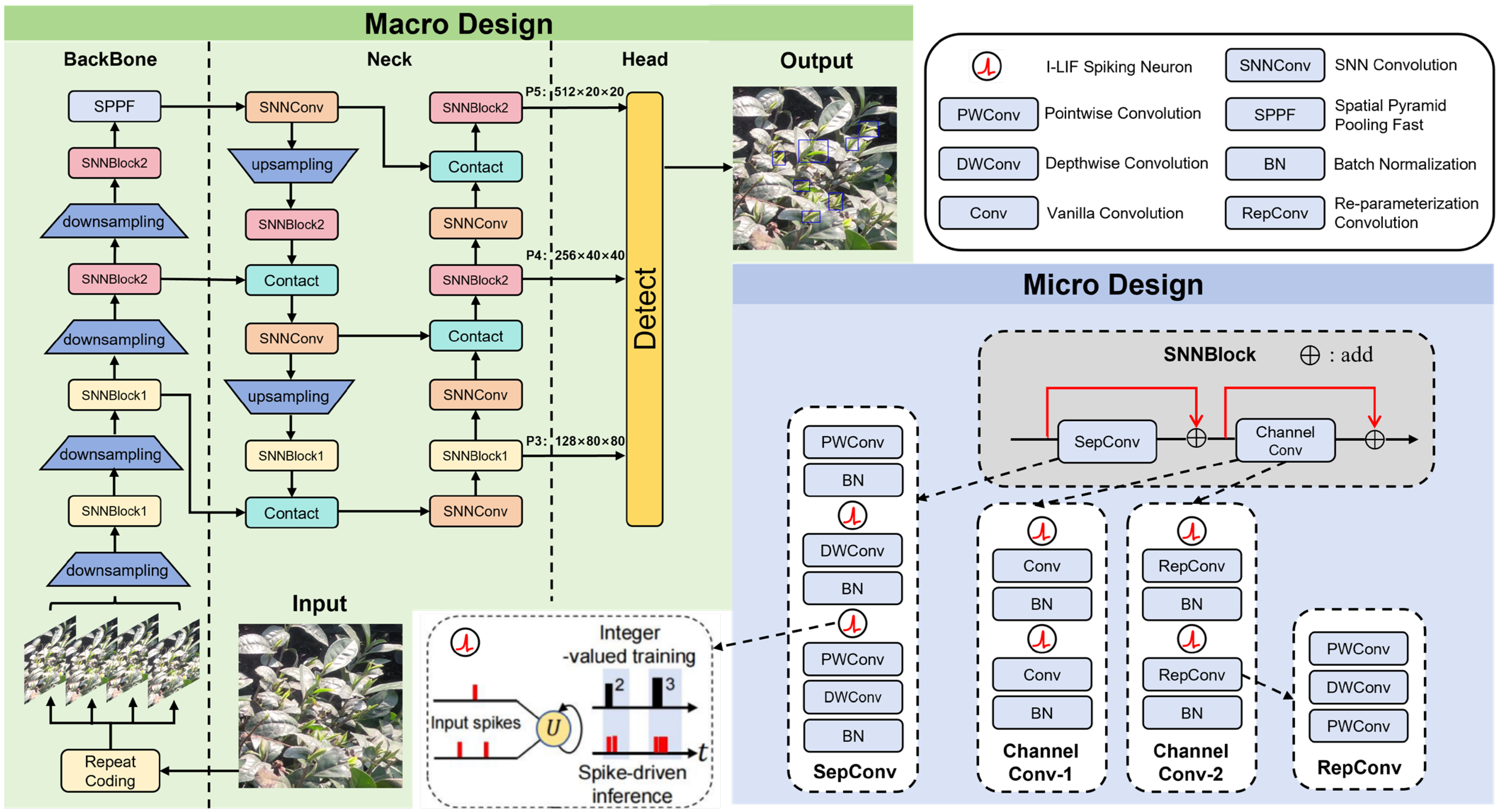 Although these deep learning models have demonstrated significant advantages in tea bud detection, their high computational demands and inference energy consumption hinder deployment on energy-constrained mobile devices. Spiking Neural Networks (SNNs), by simulating the spike-based signaling mechanism of biological neurons, perform computation and transmission only when information changes, thereby substantially reducing energy consumption and making them highly suitable for deployment on energy-limited edge devices or mobile platforms [