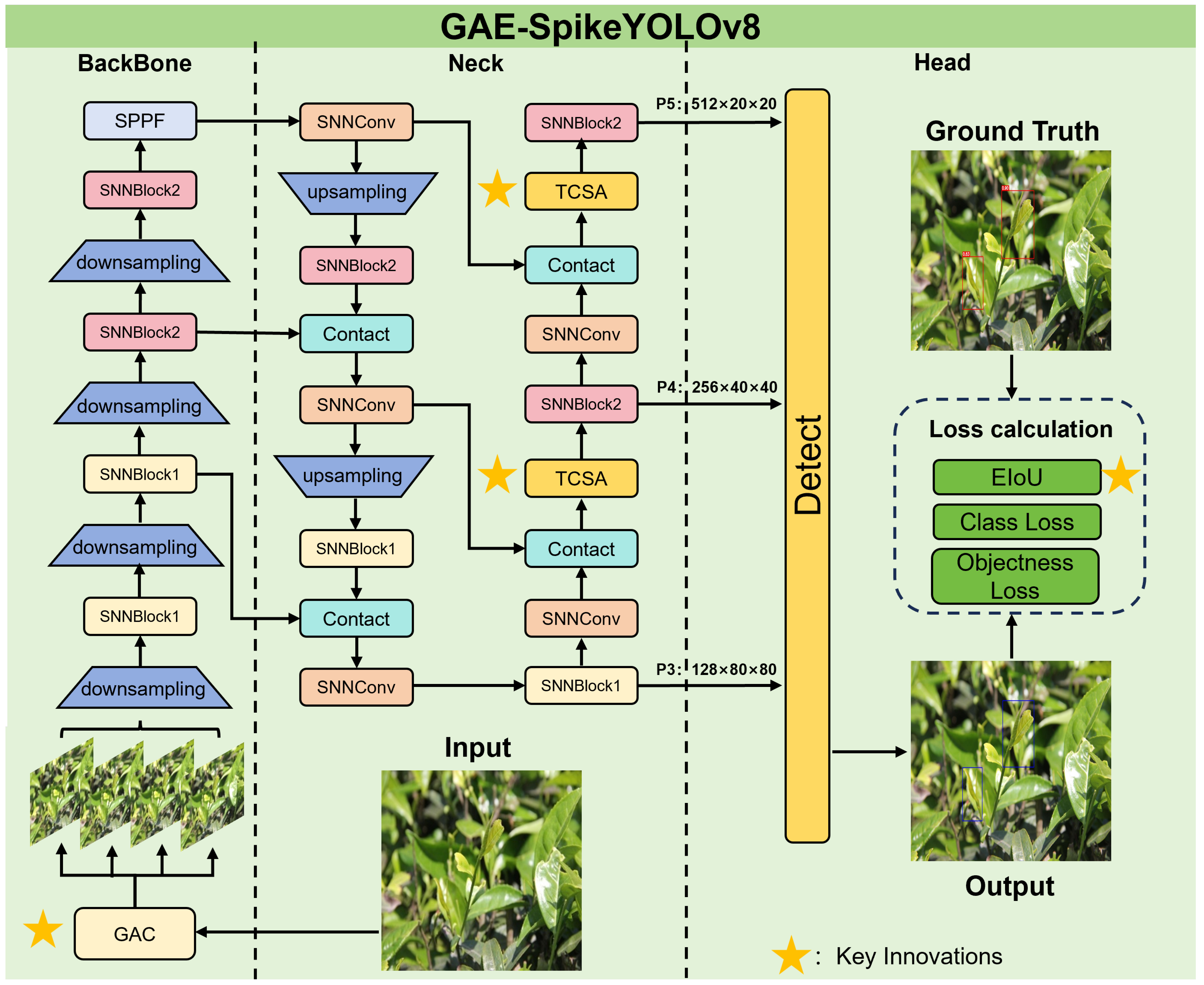 31] has achieved a major breakthrough in Spiking Neural Networks (SNNs) for object detection, demonstrating the potential to surpass traditional Artificial Neural Network (ANNs) models in detection performance while preserving the inherent low-energy advantages of SNNs, thus presenting dual benefits in both performance and energy efficiency. Inspired by this, this paper takes SpikeYOLO as the base model and proposes an improved object detection method—GAE-SpikeYOLO, which aims to enable precise tea bud detection and recognition at low energy cost. Specifically, the proposed method integrates Gated Attention Coding (GAC) and the Temporal-Channel-Spatial Attention (TCSA) module to enhance the model’s detection capability for tea buds in complex environments. In addition, EIoU is employed as the bounding box regression loss to achieve faster convergence and more accurate bounding box localization. This method provides a new solution for deploying object detection algorithms on energy-constrained mobile devices and enabling high-precision tea bud detection.