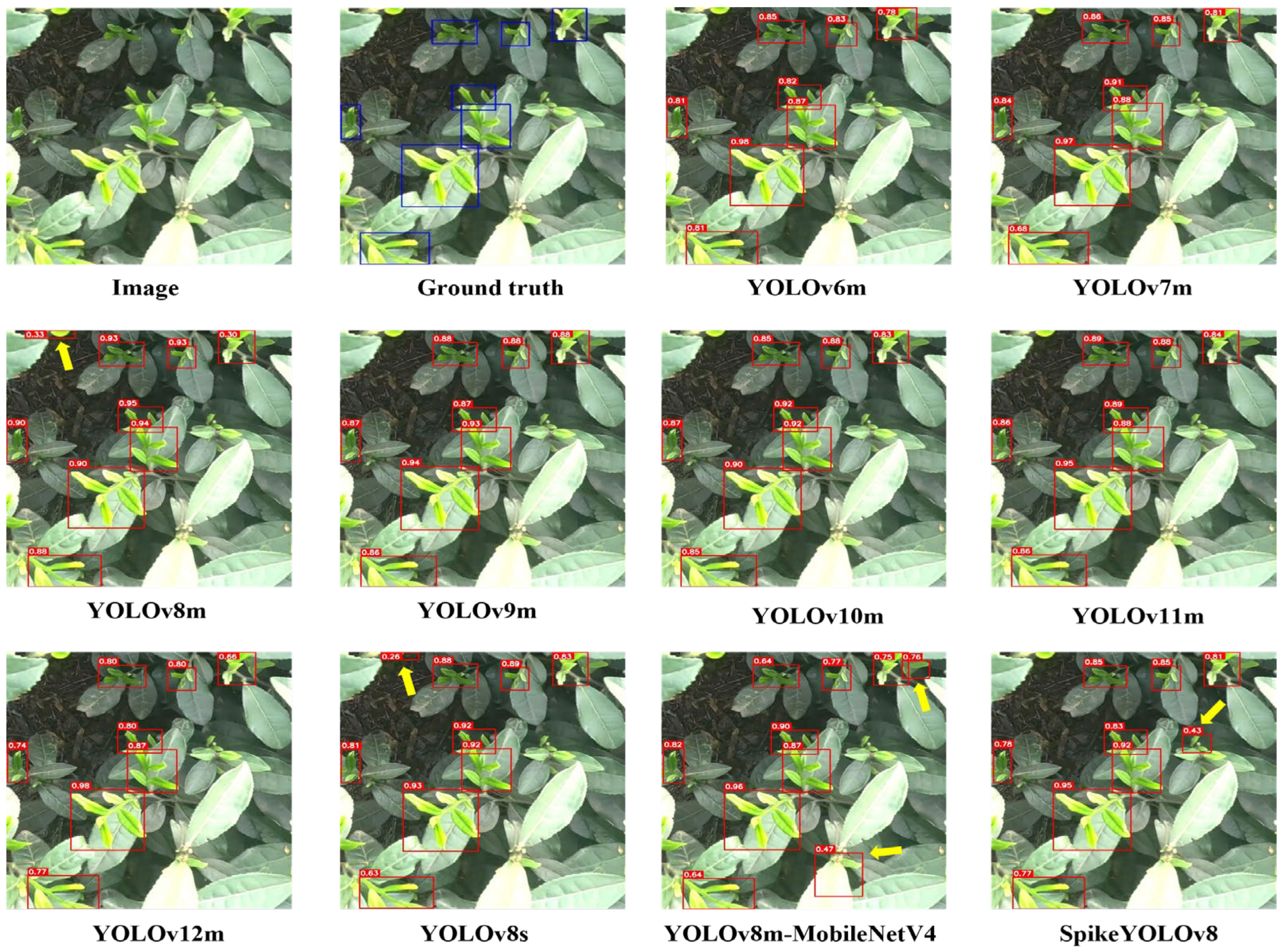 Based on qualitative analysis and ablation experiments, the proposed model demonstrates a clear improvement over SpikeYOLO in detecting small tea bud targets, while exhibiting enhanced robustness under challenging conditions such as occlusion and illumination variation. These performance gains can be attributed to the joint optimization of input encoding, deep feature attention, and bounding box regression. Specifically, the GAC module enhances the representation of partially occluded and low-level tea bud features by selectively amplifying informative spatiotemporal responses and suppressing background-induced spike activity. Moreover, the introduced TCSA module reinforces high-level semantic consistency by adaptively emphasizing semantically relevant regions, thereby reducing false detections caused by leaf occlusion, specular highlights, and background interference. In addition, replacing the CIoU loss with EIoU improves localization stability through decoupled width-height regression, which is advantageous for small and occluded targets. Consequently, the proposed model achieves more accurate and reliable tea bud detection across varying levels of occlusion and illumination conditions.