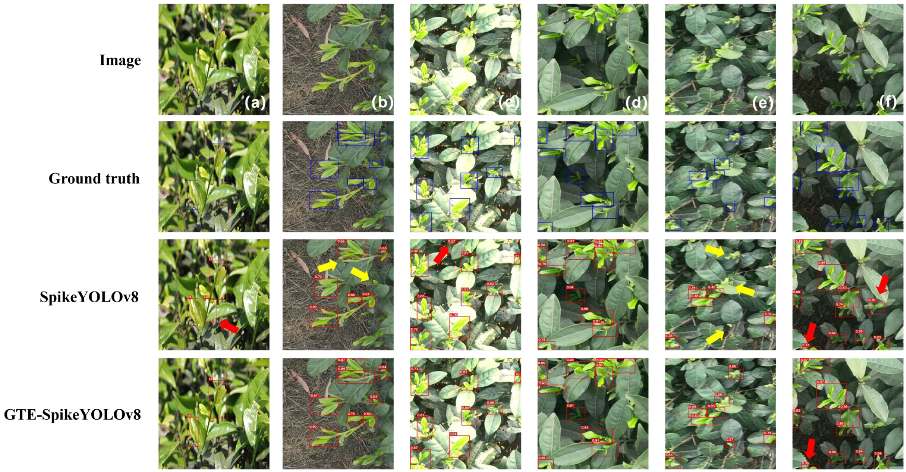 44]. At the same time, we plan to deploy the proposed model on edge hardware platforms with neuromorphic brain-like characteristics to evaluate its real-time performance, power consumption, and operational stability in actual tea plantation environments. In addition, taking advantage of the inherent energy efficiency of SNNs, we will explore the scalability of this approach to other crop detection tasks, including apples, bananas, and various other fruits and vegetables.