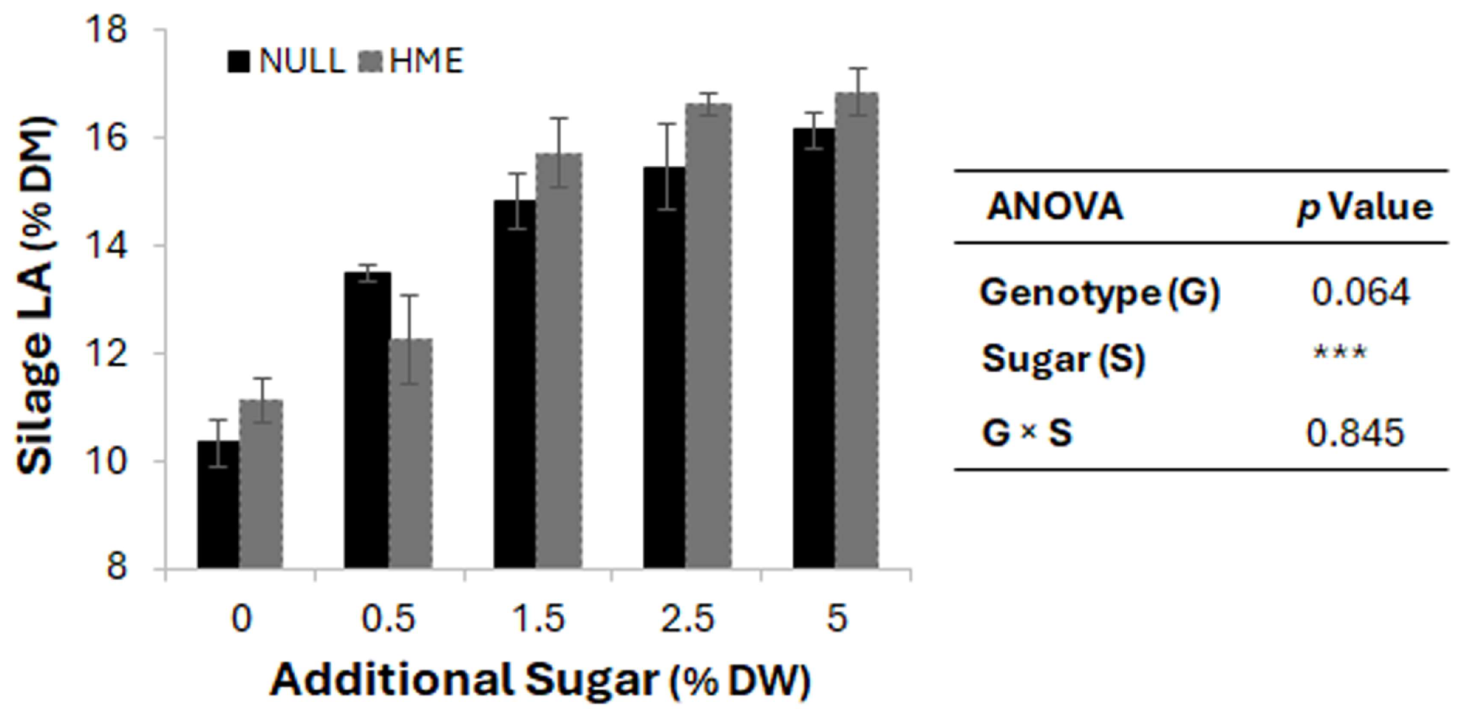 | Lactic Acid (% DM) | 15.2 ± 0.44 | 16.2 ± 0.37 | 0.1010 |