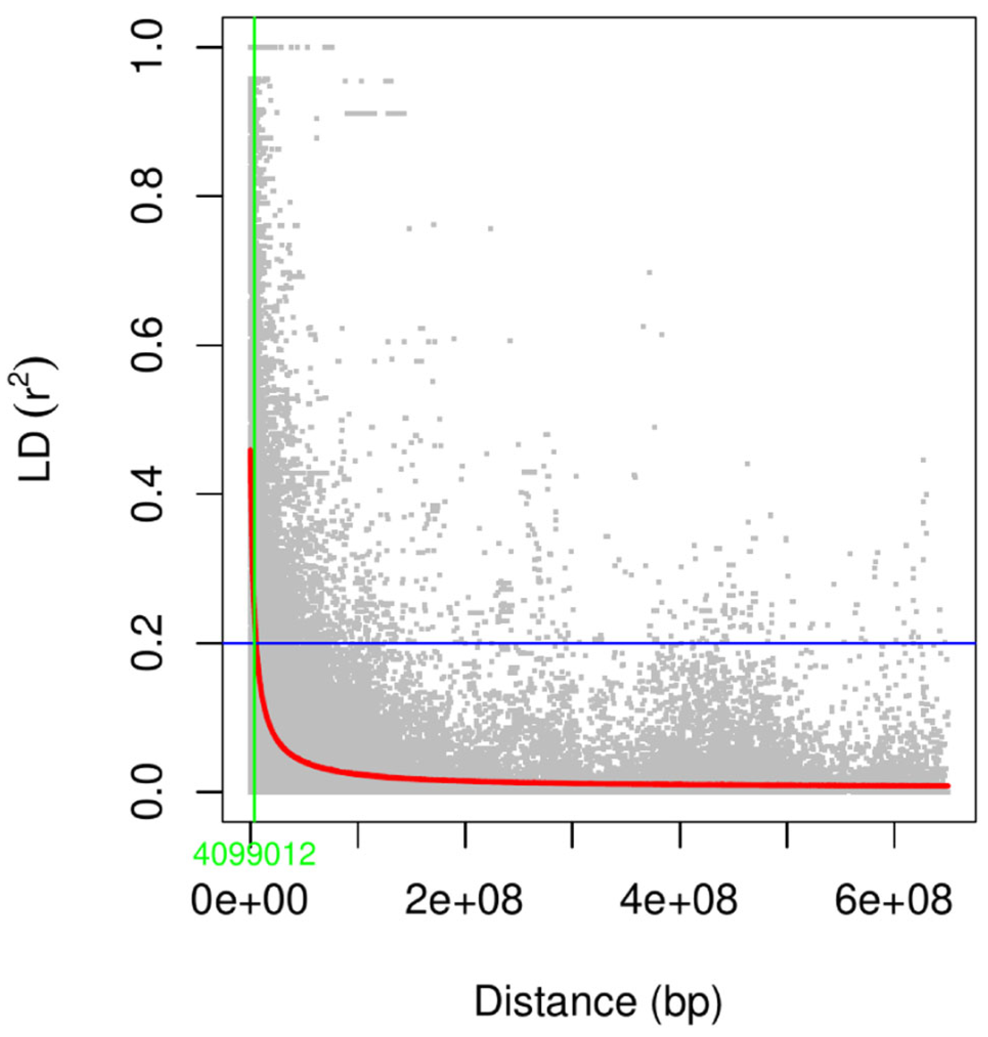 2.7. SNP Filtering, Linkage Disequilibrium, and Population Structure
