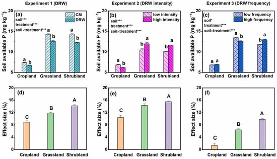 The effects (a–c) and effect size (d–f) of repeated drying–rewetting (DRW) cycles and their intensity and frequency on soil available P concentration under the different land-use types. The different lowercase letters indicate a significant difference among the treatments in the same land-use type based on the independent sample t-test (p ≤ 0.05). The different uppercase letters indicate a significant difference among the land-use types based on the one-way analysis of variance (p ≤ 0.05). ***, p ≤ 0.001; *, p ≤ 0.05.