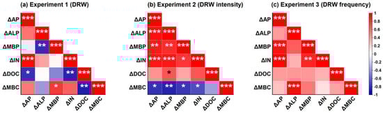 Correlations between the changes in soil available phosphorus and changes in soil properties following (a) drying–rewetting (DRW), and its (b) intensity and (c) frequency are performed using Pearson’s correlation coefficients. Δ represents changes in soil available phosphorus and other soil properties in response to DRW and its intensity and frequency. AP, available phosphorus; ALP, alkaline phosphatase; MBP, microbial biomass phosphorus; IN, inorganic nitrogen; DOC, dissolved organic carbon; and MBC, microbial biomass carbon. ***, p ≤ 0.001; **, p ≤ 0.01; *, p ≤ 0.05.