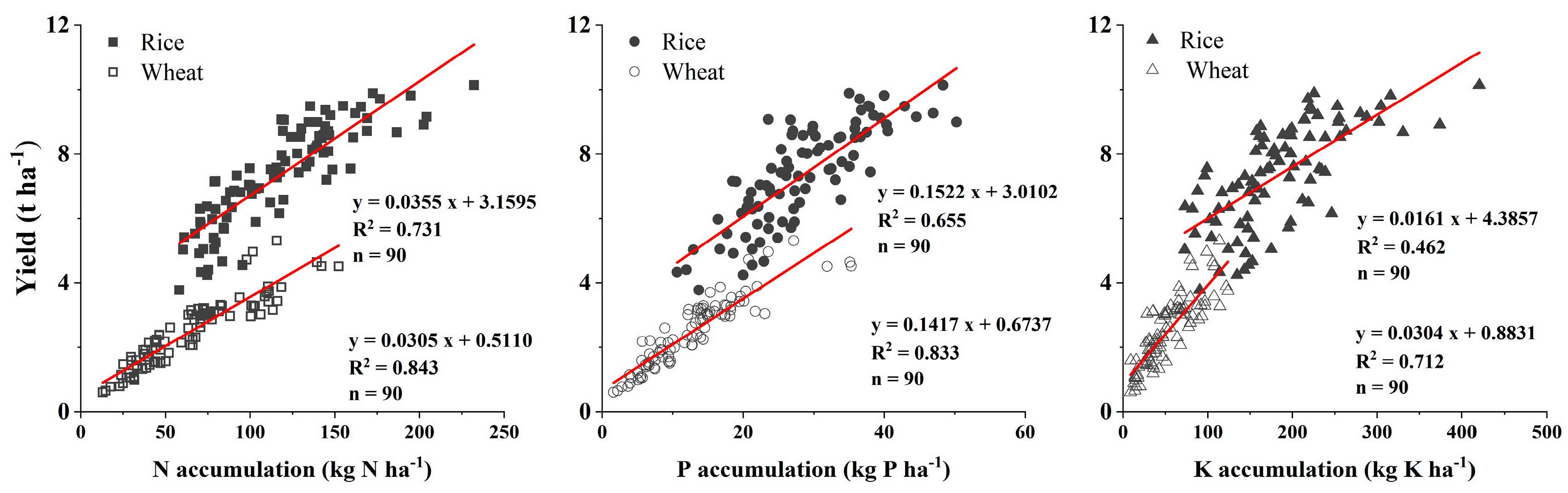 3.2. Nutrient Accumulation, Apparent Nutrient Balance, and Its Relationship with Crop Yield