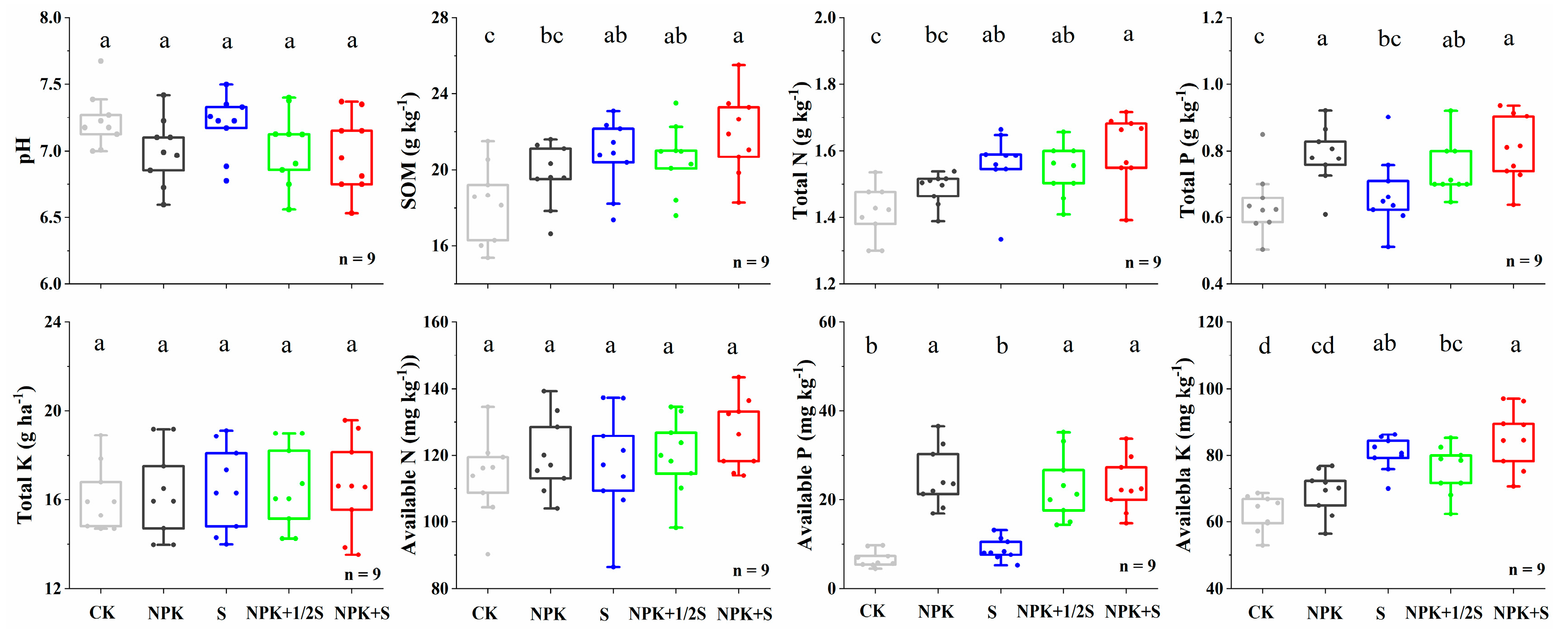 4.2. Effect of Fertilization and Straw Return on Soil Fertility