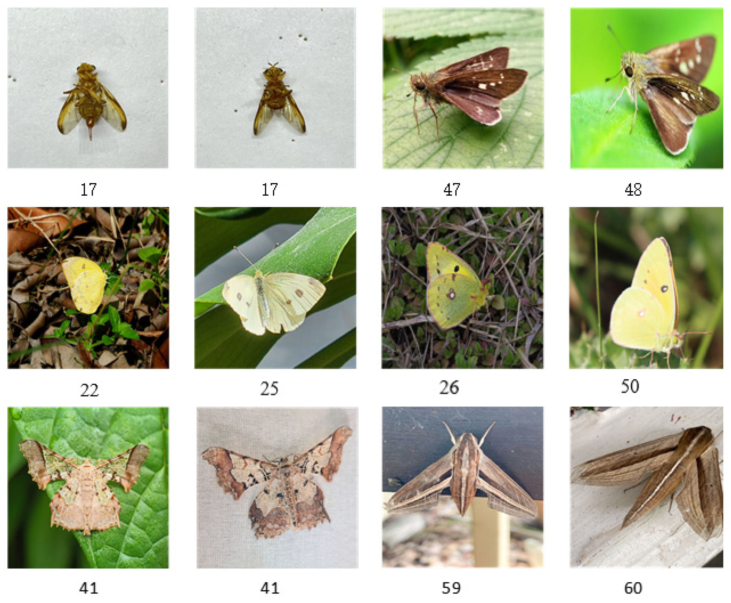 Second, high inter-class similarity exists among several species, making visual discrimination challenging. For example, species pairs such as 47 and 48, as well as groups including species 22, 25, 26, and 50, display strong resemblance in wing shape, body coloration, and overall morphology, which increases the likelihood of misclassification.