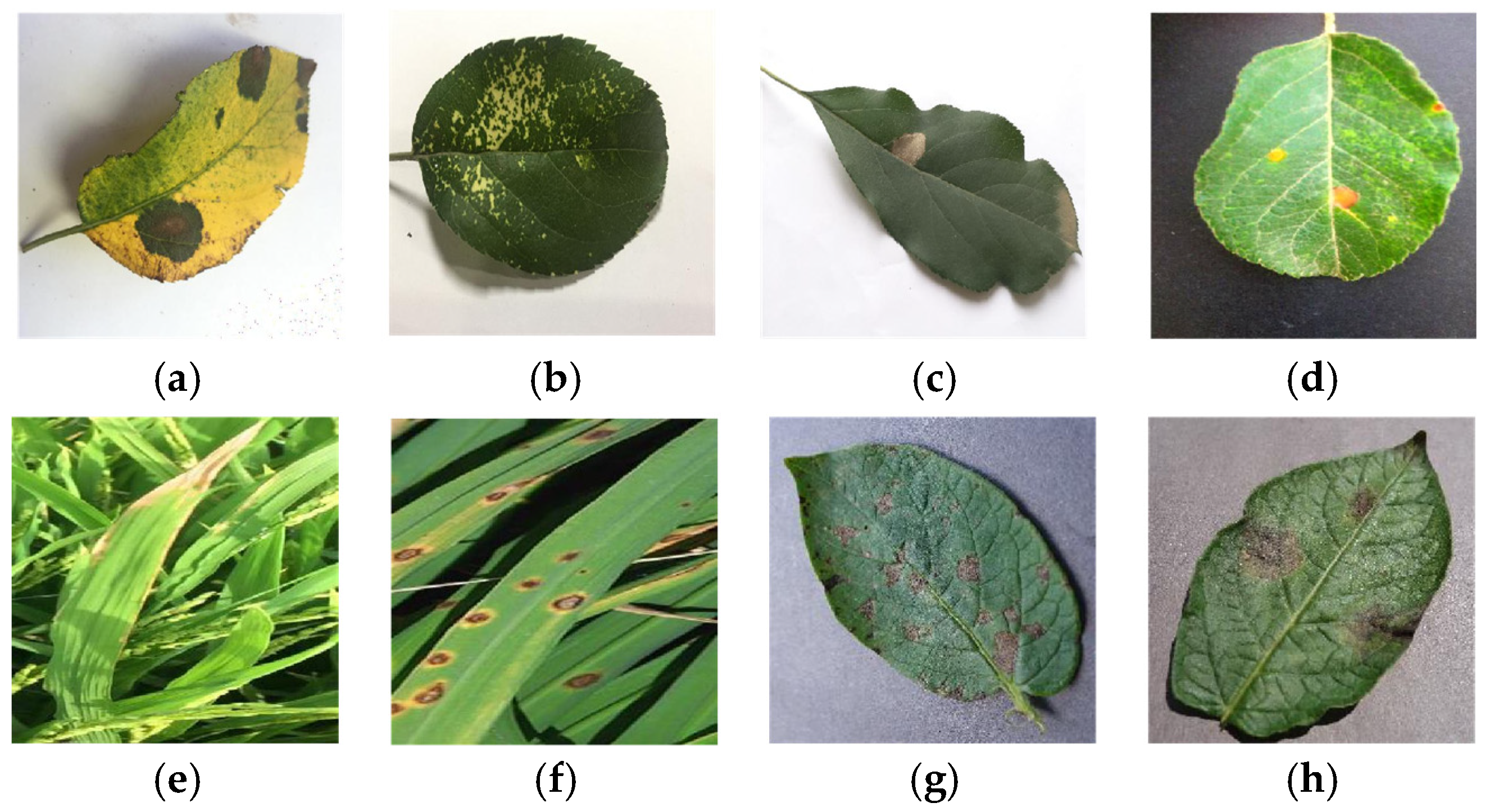 Most disease images were obtained from publicly available datasets, primarily the PlantVillage dataset on the Kaggle platform, which was constructed based on extensive experimental research conducted by the original authors and has been widely used in previous studies. To ensure consistency across different data sources, all images in the disease dataset were standardized in terms of image format and resolution. Representative samples from the disease dataset are shown in