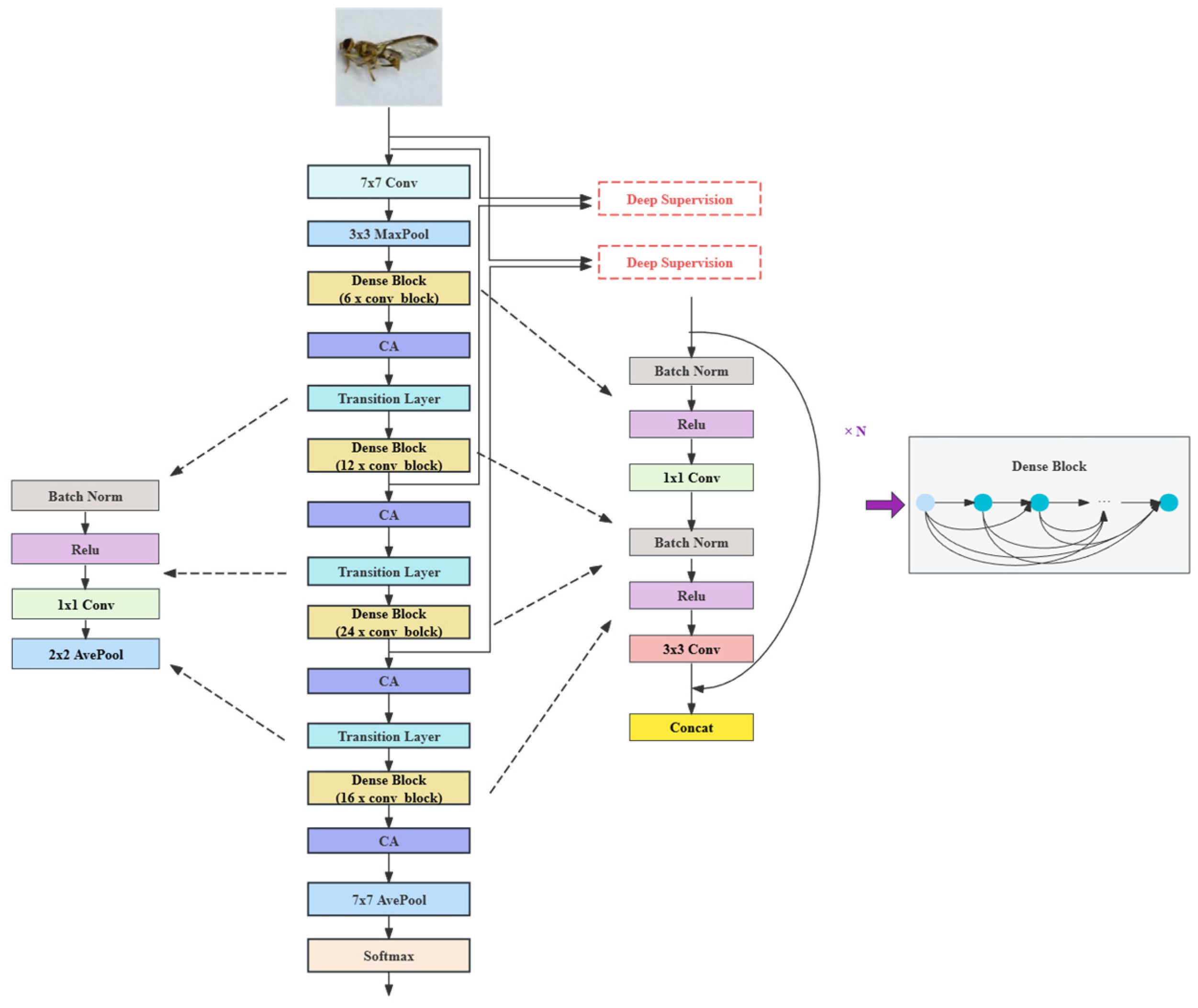 Second, to alleviate gradient vanishing and improve training stability, deep supervision branches are introduced after the second and third Dense Blocks. By allowing intermediate feature representations to directly participate in loss backpropagation, deep supervision enhances gradient flow and encourages effective feature learning at different network depths. This design enables the model to capture multi-scale semantic information simultaneously, which is particularly important for recognizing agriculturally harmful organisms that exhibit large variations in size, morphology, and appearance.