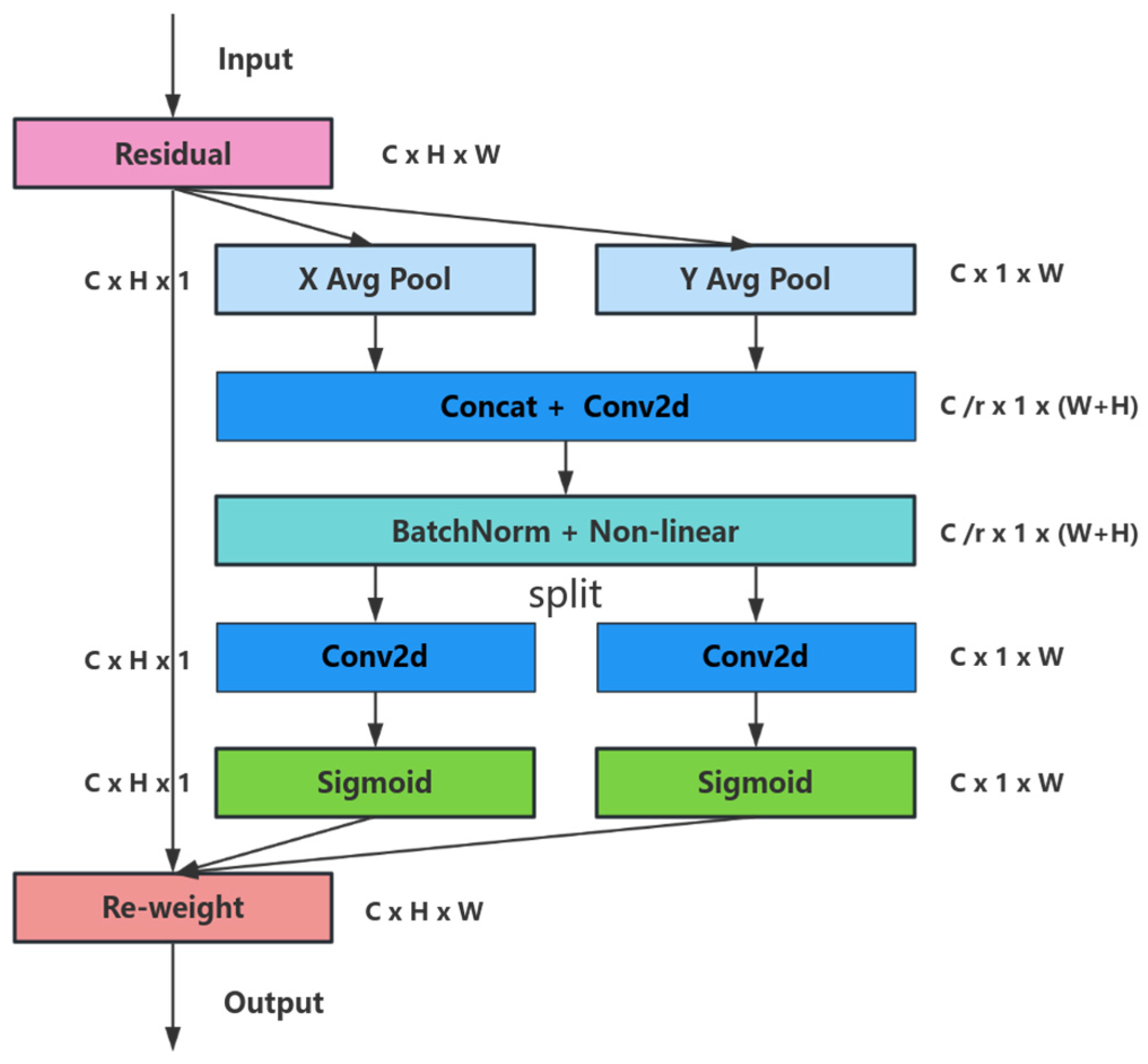 First, a Coordinate Attention (CA) mechanism is introduced after each Dense Block. While DenseNet effectively promotes feature reuse through dense connections, its ability to explicitly model spatial location information and long-range channel dependencies remains limited. The CA module addresses this issue by embedding positional information into channel attention. Specifically, it decomposes conventional two-dimensional global average pooling into separate horizontal and vertical encoding processes, enabling the network to capture both spatial structure and channel-wise importance simultaneously.