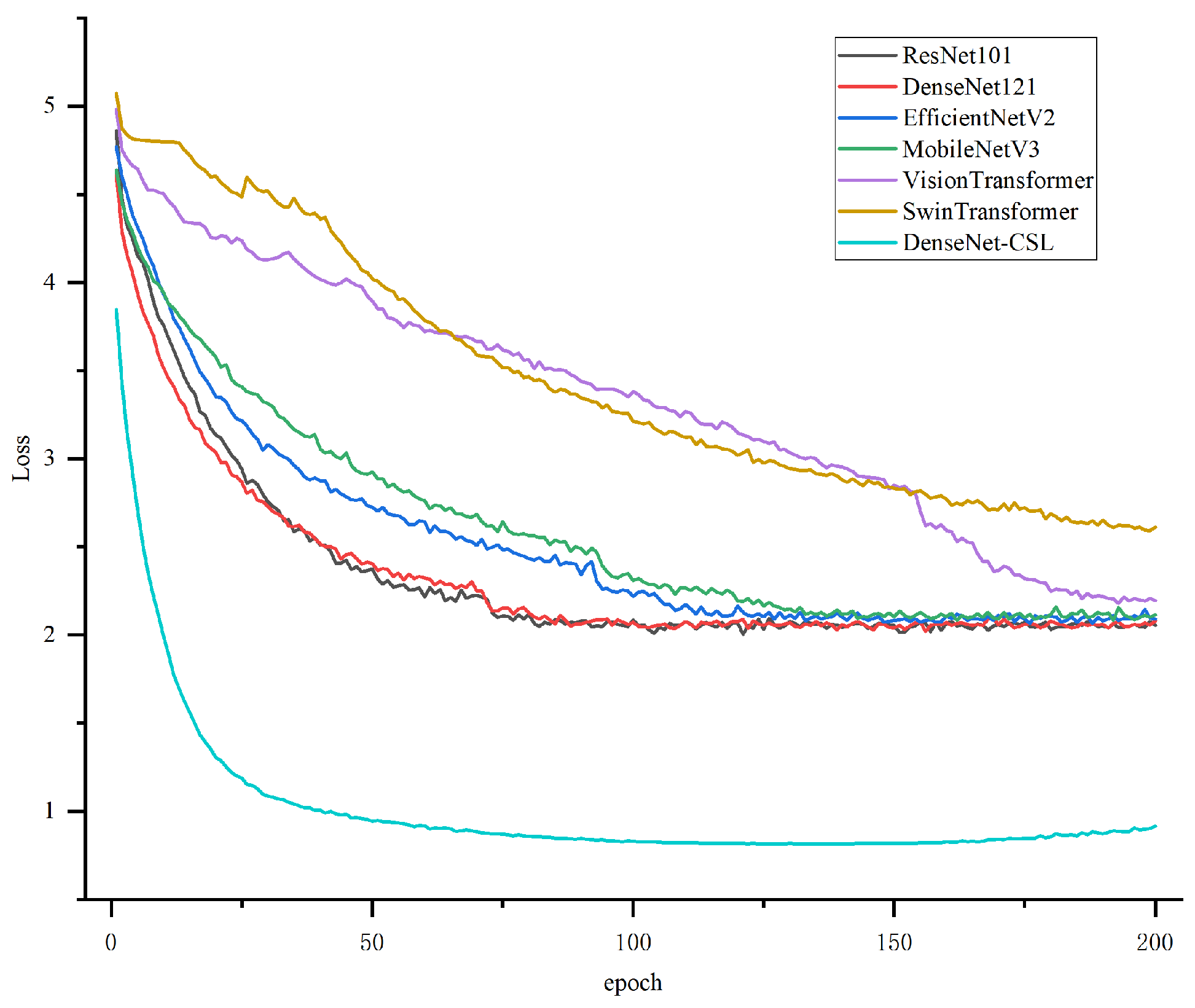Figure 8 illustrates the loss curves of the seven models during training.